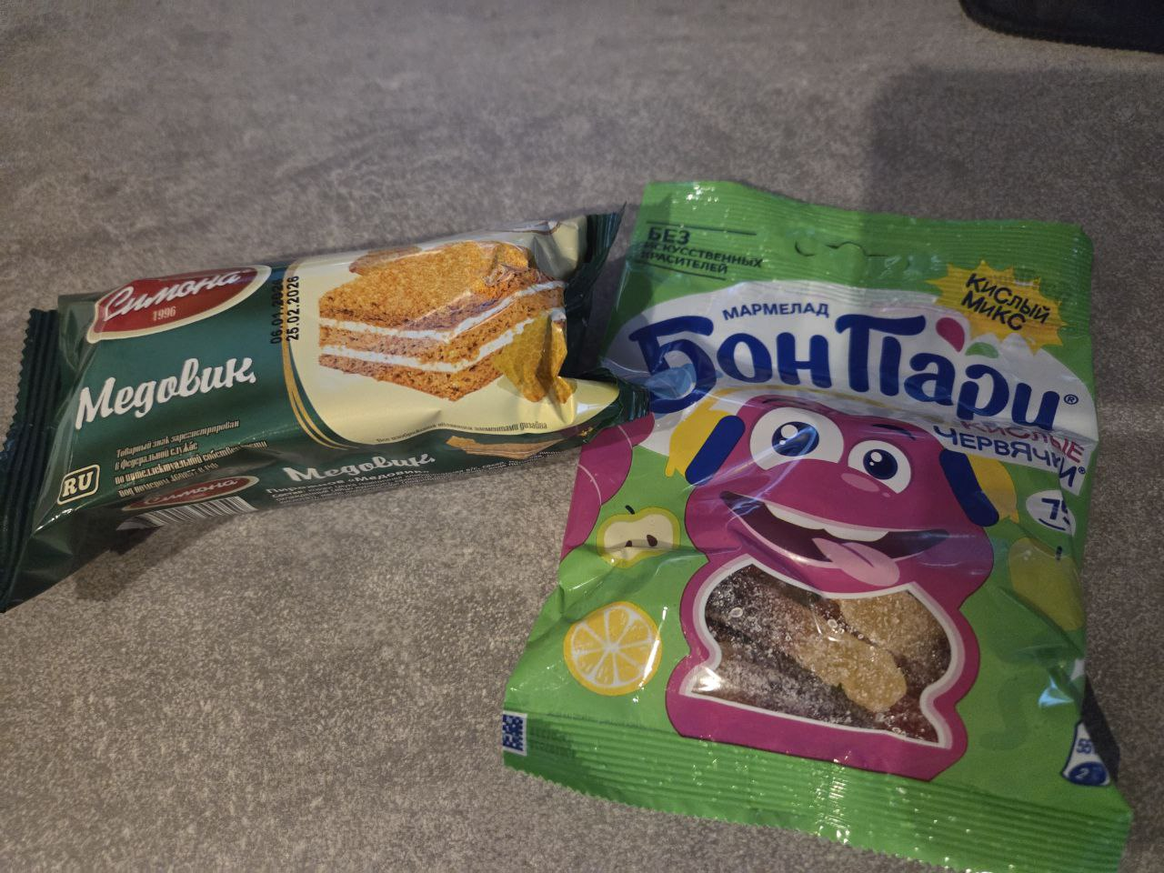 блиииин я короче посмотрелу фирму медовика и поймала себя на мысле что у нас в москве таких не видела погуглила эта фирма медовиков продается в красном и белом выходит что малышок ходил за алкашкой и купил нам червячков и пирожное там