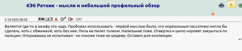 >>1001056 >Еще один довод против. Какой довод то? Месяц назад точил, не помню уже. >>1001060 >А зачем продаешь? Да как то пришел к тому, что носить и пользоваться этим я не буду. Точить это много раз нельзя, доп сложности в заточке напрягают. А для полки и любовании ножей мне хватает.