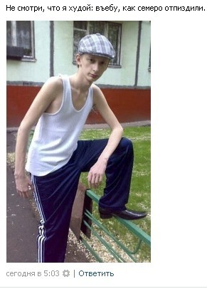 >>1002926 > в случае смертельной битвы он тебе вообще пальцы откромсает. Твои! Не противника! Так это же охуенно. Тебя хотели помять или обоссать, тут ты выхватываешь нож, отрезаешь себе пальцы, дико орешь с выпученными глазами, кровища хлещет во все стороны, на тебя, на противника, на зрителей, женщины кричат, дети блюют, собаки пиздят твои пальцы и давясь жрут поскорее пока не отобрали, кто-то орет "остановите кровь!", кто-то "блядь я забыл номер скорой!", все в ахуе, противник уже по сьебам дал, он вообще не ожидал такой хуйни, чтобы кровища фонтаном и веер пальцев на снегу, он просто децл утвердиться хотел а тут такой пиздец. В итоге ты отделался всего-лишь парой пальцев. А будь у тебя в руках глок или кизляр - ну пырнул бы ты оппонента, приехали бы менты, повалили тебя, отпиздили (как изначально хотел оппонент, только у них умения больше), в изоляторе цыгане выебали в жопу, судья дал 10 лет (ибо носил финку с умыслом и убил человека хотя угрозы жизни не было), и чо, лучше тебе стало? Первый вариант как-то козырнее выглядит.