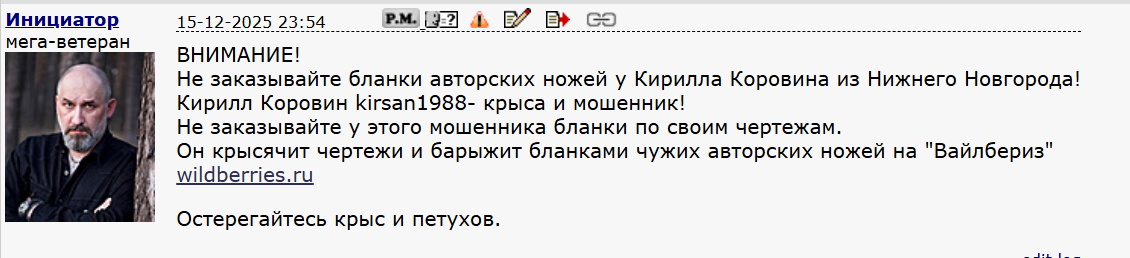 >>1002912 >Очень странная херня Да я думаю там было все прозаичнее. Они скорее всего отправили большую партию, чтобы у нас где-то на складе хранить. А среди партии могла затесаться запрещенка и всю партию могли просто задержать. Недавно случай был у одного известного магазина, по незнанию в большом заказе были XL риэйты. И все, хлопнули моментально. Уже несколько месяцев ни туда ни сюда посылочку сдвинуть не могут. >ОК в пиздеже замечены не были. Заявлено VG10. Были тесты и с М390, вроде +/- норм. От себя могу сказать что проверял твёрдость, и заявленных 63 HRC там было. Тогда определенно надо заморочиться и через посредников взять. Как фиджет ножик просто 10/10, а если еще и клиночек хороший то 50баксов это вообще не цена для такого.