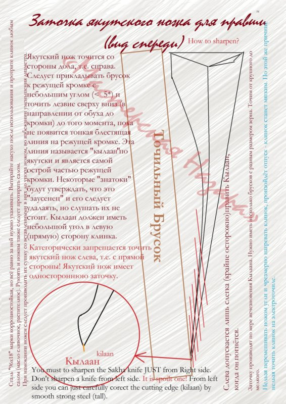 Тут есть знатоки теории по якутским ножам? Пару лет назад мне подарили якутский нож и он произвёл на меня довольно приятное впечатление по режущим свойствам, хотя местные обитатели сказали, что хорош он только для строганины. Дождался я оказии в виде аутентичного мороженого чира и опробовал нож, как мне казалось, по назначению, сомнения возникли уже на этапе обрезки плавников, пришлось прилагать довольно ощутимое усилие для такого клинка(стамеска в ноль с одним микроподводом), к тому же один раз нож у меня сорвался на мягкую стальную раковину, сама нарезка строганины легка и приятна, по итогу рк получила небольшие участки выкрашивания. Возник ряд впросиков: 1. Сколько якутских ножей должно использоваться для разделки и нарезки рыбы? Я бы предпочёл минимум 2 2. Как правильно править и точить, учитывая имеющие место противоположные мнения, да и ножи делают сильно разными? 3. Виновато ли в выкрашивании "модерновое" исполнение с плоским спуском и материалом в виде 95х18?