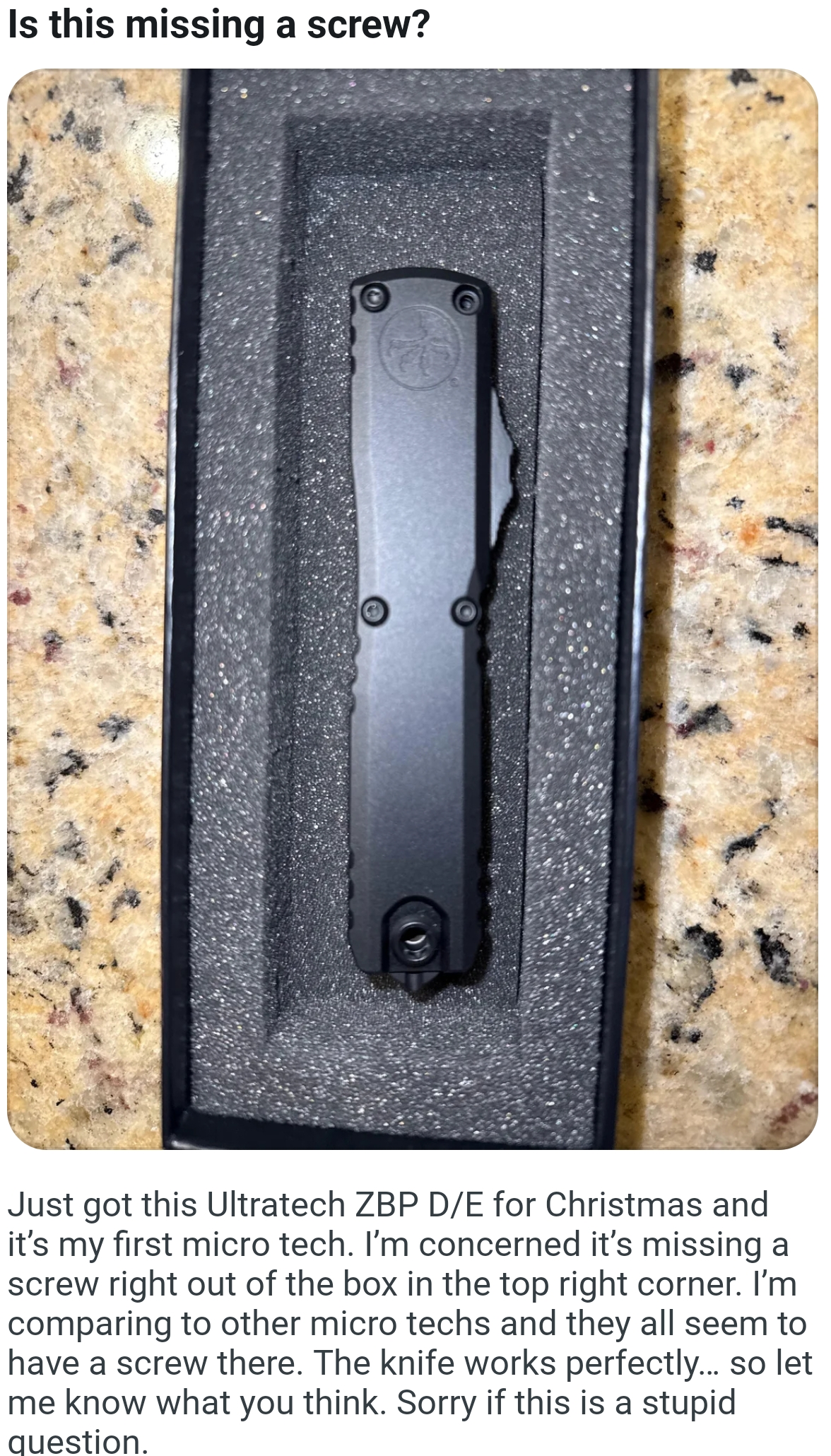 Муриканское качество выходит на новый уровень. Антоха раздрота забыл выкрутить винт. ОТК у микротека просто отсутствует, либо там сидят слепые обезъяны. Ебало представили, когда купил дорогой нож, и потом приходится за свой счёт его отправлять?