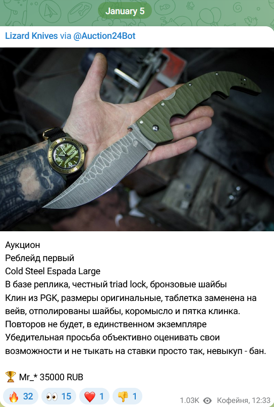 >>1002308 Срочно нужна новая классификация ножей. Регистрируем товарную марку "Нормальный нож". Пункт первый: нормальный нож не лежит. Пункт второй: находятся в использовании... Пункт -дцатый: обязательный переход детям или внукам.., нет детей или внуком - с ножа снимается галка "нормальности".