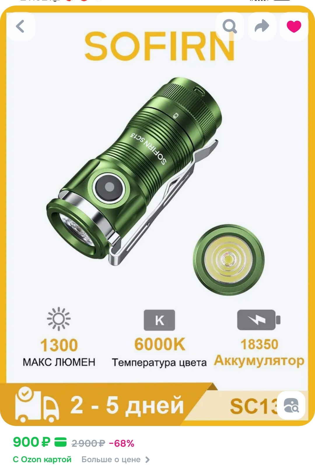 Купил тоже недавно софирн сц33, нормально вроде, ярко светит. Один раз даже использовал под машиной посветить, лол. Хотя в авто ради прекола вожу маглайт.