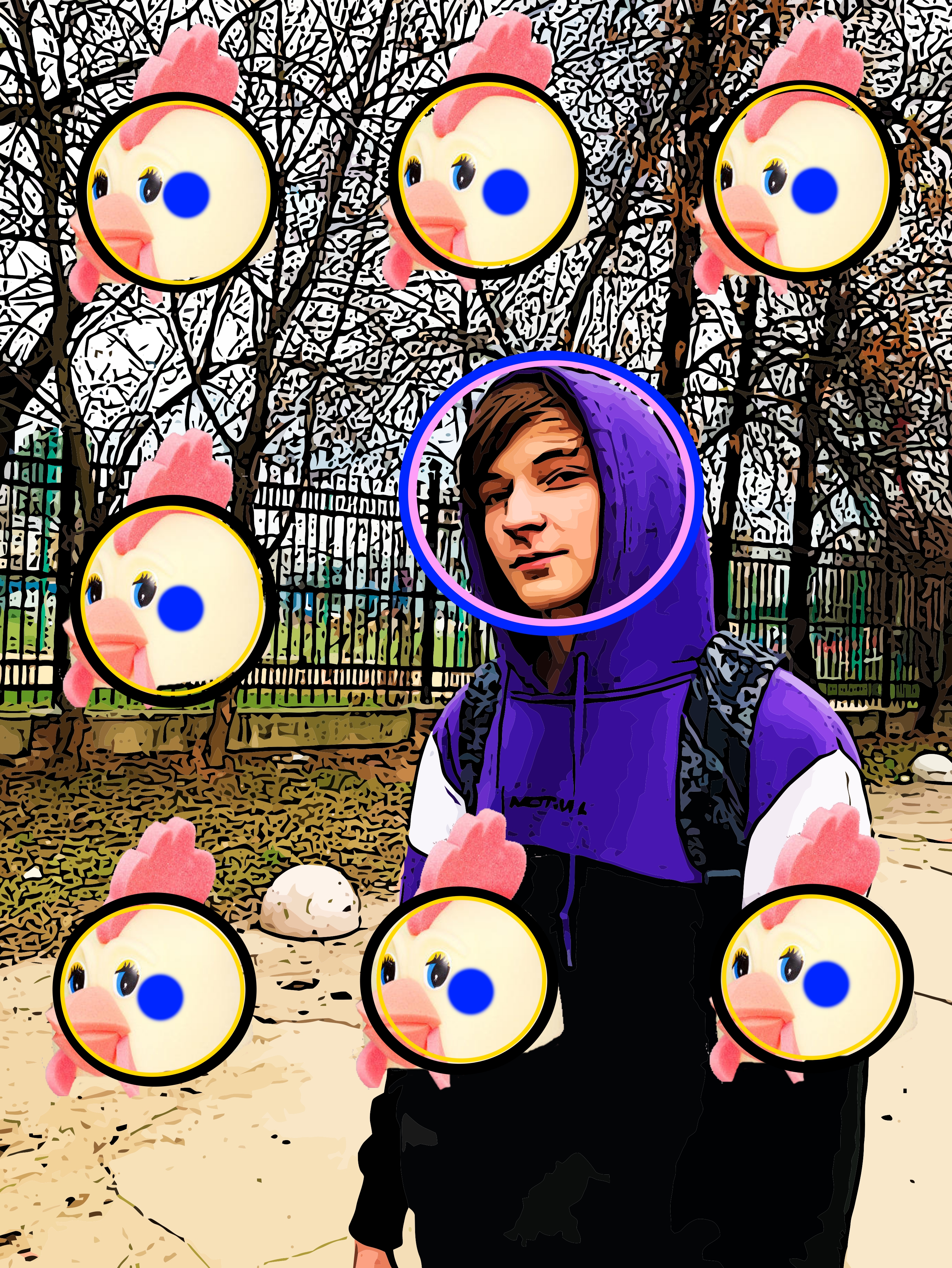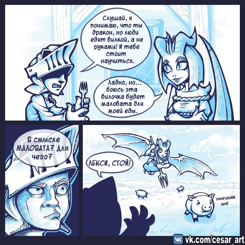 Гигантская улитка медленно ползла по траве, пожёвывая зелень. Животные редко смотрят в небо, а зря. Там, среди облачков и тучек, показалась серая туша звездолёта. - Пыпыры пыры ры... Ням! - пела улитка. Вдруг перед ней в землю воткнулись вилы. - Чо за... Тут же сбоку воткнулись вторые, а по раковине брякнула длинная труба. - Э, вы чо там нафиг... Улитка обратила антенны глаз к небу, в котором висел странный зверь, незнакомый ей доселе. В чёрно-бело-фиолетовой шкуре и с дымящим горбом за спиной. - Ты, хер летучий, смотри куда мусор кидаешь! В ответ донёсся высокий голос "Я такой как я есть", а вилы вспыхнули и сгорели. Заворожённая пламенем улитка пропустила тот момент, когда к летучему зверю подлетел другой, врезал ему по рукам и оторвал кусок шкуры, прикрывавший шею летуна. Когда она снова посмотрела вверх, там было пусто, лишь кусок фиолетовой тряпки медленно спланировал вниз. - Совсем с ума посходили... Бросаются всяким, летают где не попадя. Так и убить могут. Улитка спряталась в раковину и решила до следующего утра не высовываться, мало ли что.