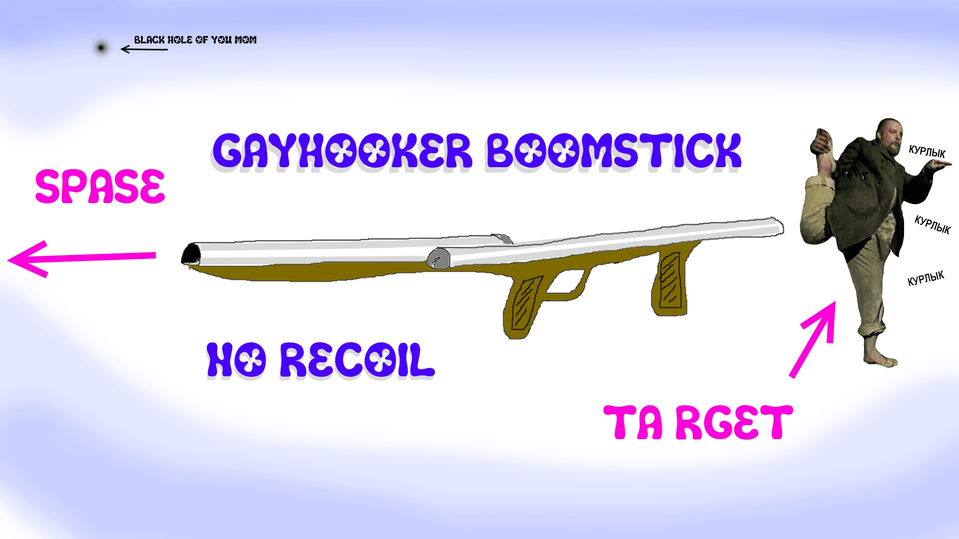 >>882573 (OP) >Если вы хотите, то можете и сами что-то рисовать здесь, я не против. Я полагаю что двудулка, стреляющая с плеча как гранатомёт сразу в обе стороны не будет иметь отдачи и космонавт не улетит к ебеням. Однако задний патрон предлагаю заряжать чем-то мягким и тяжёлым, чтобы не ёбнуть своих. Твёрдый заряд из твёрдого металла суём только в передний ствол. Так будет безопаснее. а патроны делаем разных цветов, чтоб не путать.