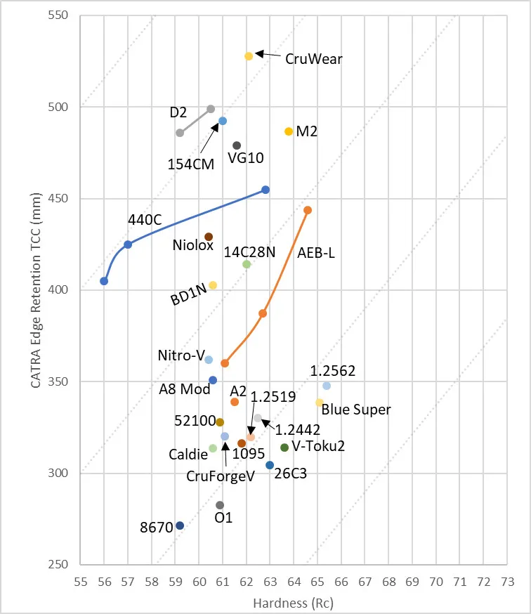 Учти что Catra тест это тест на износостойкость, т.е. абразивное истирание. Притом момент остановки этого теста это очень низкая степень остроты. Режешь картон - тест этот полезен. Строгаешь дерево - не сильно.