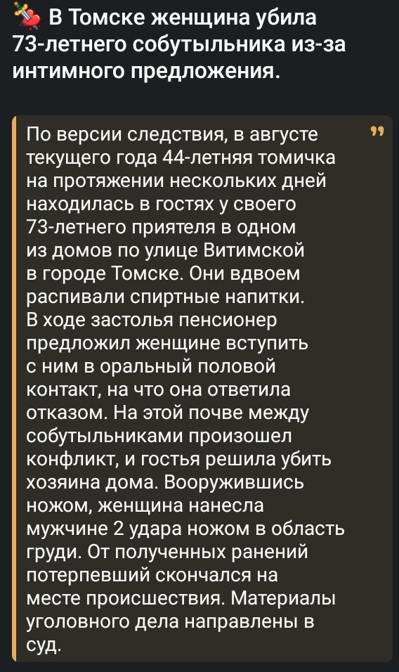>>963628 Регулярно с таких историй кекаю. Был бы вместо ножа кастет, история вышла бы не такой мрачной. Но кастет незя, это ж холодное оружие, и дядя полицай сразу отберет. А нож можна, он же у гражданина на кармане был чтоб колбаску на улице порезать, да? Нож это норм, это ж хозбытовой инструмент. Пусть граждане дальше друг друга режут. Бля ну разрешили бы маленькие 20-сантиметровые дубинки хотя бы с собой носить. Создали бы свое производство, заслали на обзор продажным блогерам, стали бы красивые фоточки в запрещенный инстаграмм выкладывать. Сразу количество трупов уменьшилось бы.