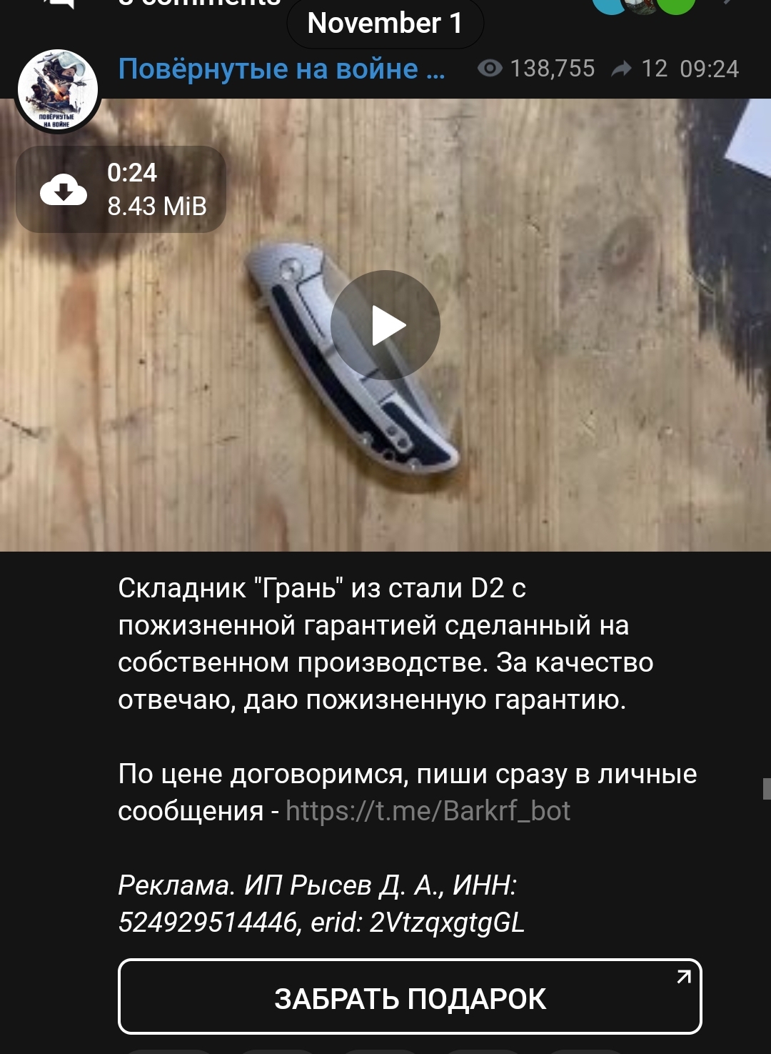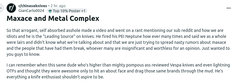 >>963610 Понеслось говно по трубам. Ютубер gvg4 metal complex облизал maxace neptune, одна беда, в комментах стали появляться люди у которых эта хуйня лопнула. В ответ автор стал обвинять их в пиздабольстве. (https://www.youtube.com/watch?v=CY_OoEn81QU) Потом порвалась сабветка реддита о китайских ножах, на которые и всплыли первые фотки брака. https://www.reddit.com/r/chineseknives/comments/1gs3p26/maxace_and_metal_complex/ Тем временем Медуза в ультеме тихо пропала из продажи. Злопыхатели утверждают что из-за гигантского количества брака была снята с продаж. Поклонники - модели такая охуенная, что была раскуплена.
