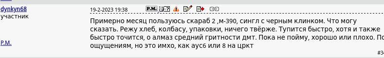 >>964908 У меня есть йоба-нож для суровых охотников из х12мф, режет он хреново (геометрия) и в качестве охотничьего не годится, но зато открыть банку или нарубить веточек для костра — норм, и не жалко. Для всего остального я запасся морами и опинелями. За 15 лет запас мор (купил как-то 5 углеродистых, 5 из нержи и одну 2000) и опинелей (тоже 5 углеродистых, 5 из нержи девяток) подошёл к концу по схеме "израсходовался от износа, потерял, был сломан придурками". И вот сейчас я смотрю на всё это раздолье ножей на рынке, и что-то ничего особо-то и не приглядывается, вот что сейчас принципиально новое и лучшее (которое враг хорошего)?