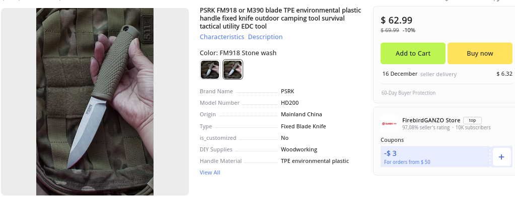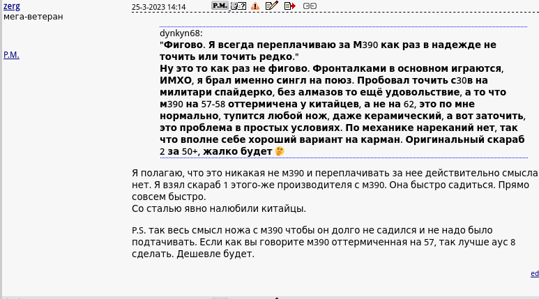 >>964815 Я не сказать, что завсегдатай маркетплейсов в плане ножей, но если бы пришлось выбирать, то больше доверия у меня маркетплейсу, чем мутному телеграм-магазину без креденциалов и адреса. Ну какой дурачок будет покупать хкй знает что в телеге, сделанное хрен знает кем? >>964828 Этот порошковый быстрорез очень хрупкий во всём диапазоне своей целевой твёрдости (67-72 HRC), нахуя делать из него бытовой нож — непонятно. Рабочий диапазон для ножей — 59-65 HRC.