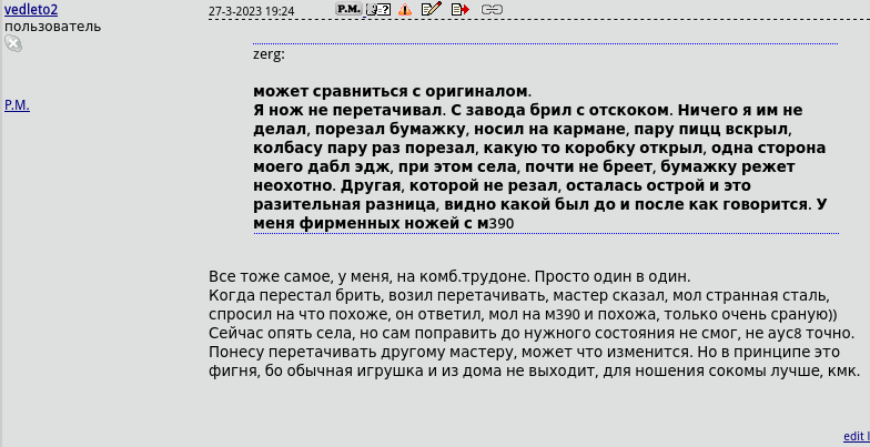 >>961796 >У тебя есть другие ножи из такой же стали для сравнения? Это единственный нож из Cromax PM (Lohmann), который у меня есть, но имеются другие кухонные из порошковых сталей. Например, кухонный из Elmax дольше держит кромку, но рез отличается в пользу owlknife, но это, полагаю, исключительно из-за геометрии и спусков (нож из Elmax с углами для более тяжёлых работ).