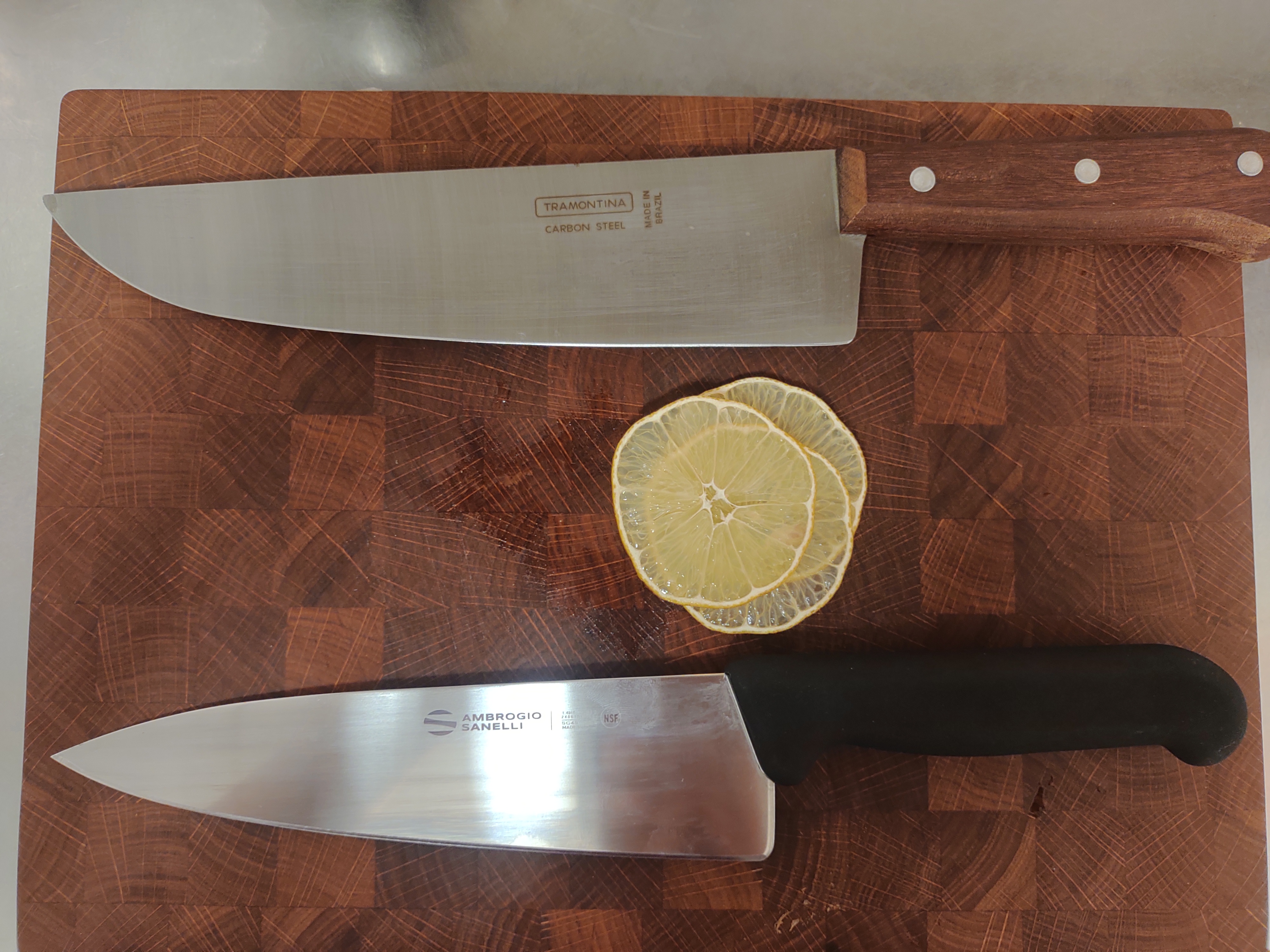 >>963914 Попробовал 20см шеф Ambrogio Sanelli из Nitro-B. Заодно Tramontina 24 см шеф из углеродки. Санелли обработан и финиширован очень хорошо (трамонтина хуже), сведение тонкое от обуха, легкий нож, баланс идеальный (на трамонтине тоже), ручка — шершавый полимер. Заточка с фабрики — ну такое, пришлось подвести микрокромку чуть, потом переточу нормально. На трамонтине фабричная заточка сразу норм, чуть подвёл на микронном бруске. Твёрдость закалки — выше, чем на обычном еврошефе и про-серии трамонтин из нержи, возможно даже чуть твёрже, чем на углеродистой трамонтине, но точно меньше 60. Кромка у ножа из Nitro B сводится очень тонко, режет весьма хорошо. Рез лучше и работать комфортнее, чем обычными толстыми еврошефами из мягкой 1.4116 и проф серией трамонтин из нержи 1.4110. На углеродистой трамонтине качество реза сравнимое. Однако, до моих эталонов качества реза (сантоку из широгами и R2/SG2 и опинеля 12 из углеродки) не дотягивают, но тут, возможно, дело в геометрии, потому что сантоку из SG2 сведён в нулину как бритва. В общем, без чудес, но внезапно годная бюджетная нержавейка с хорошим резом для кухни, может, кому надо. Обратите внимание, что нож этот — для людей с навыками работы (это, тащемта, серия для профкухни, а не для дома), поэтому высок риск, что среднестатистическая домохозяйка, привыкшая к тупым тяпкам, ухерачит подобный нож на раз-два.