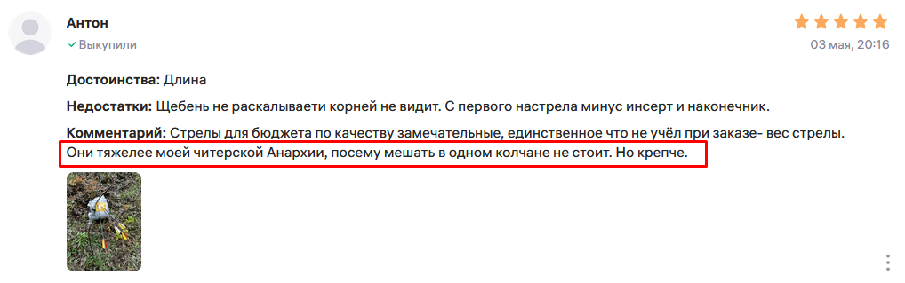 >>992548 >плюс их ещё и прижимная пластина задирает Бля а это как вообще возможно? Может у тебя чёто другое мешает вовсе, типа снизу в направлющей может перо в конце задевает и поднимает стрелу? Прижимная пластина должна прижимать стрелу в месте где она уже не должна никак гулять >я даже ещё прицел не выставлял Бля так ты даже ещё не стрелял? Пиздец... >>992552 >Плюс она весит ~450 гран, Ну на странице магазина написано вдвое меньше, но приэтом заявленные цифры пахнут пиздежом каким-то. Если они весят 450 гран то вряд ли они карбоновые, да и по цвету типикал "микс" https://www.ozon.ru/product/strely-dlya-arbaleta-12-sht-1379183554/ Я вот эти брал, цена просто охуевшая, а качество приемлемое, за такие бабки точно не говно >другие подобные от 1000 рублей начинаются. Потому что в них утяжелители из цветмета, твои же скорее всего сильно легче, потому что даже "болт" 22" из цветмета весит 442 и считается дохуя тяжёлым и стоит всего 750р за штуку