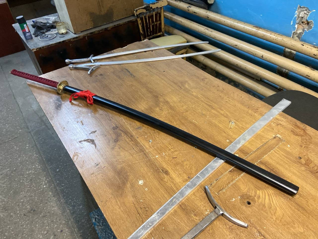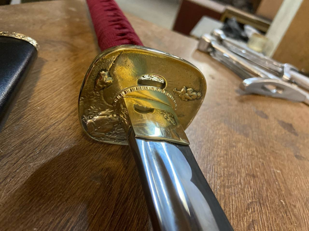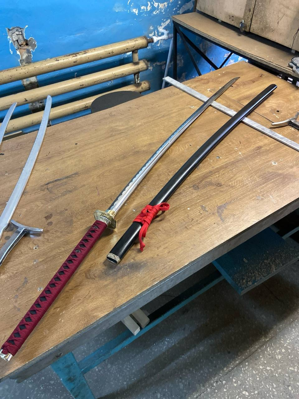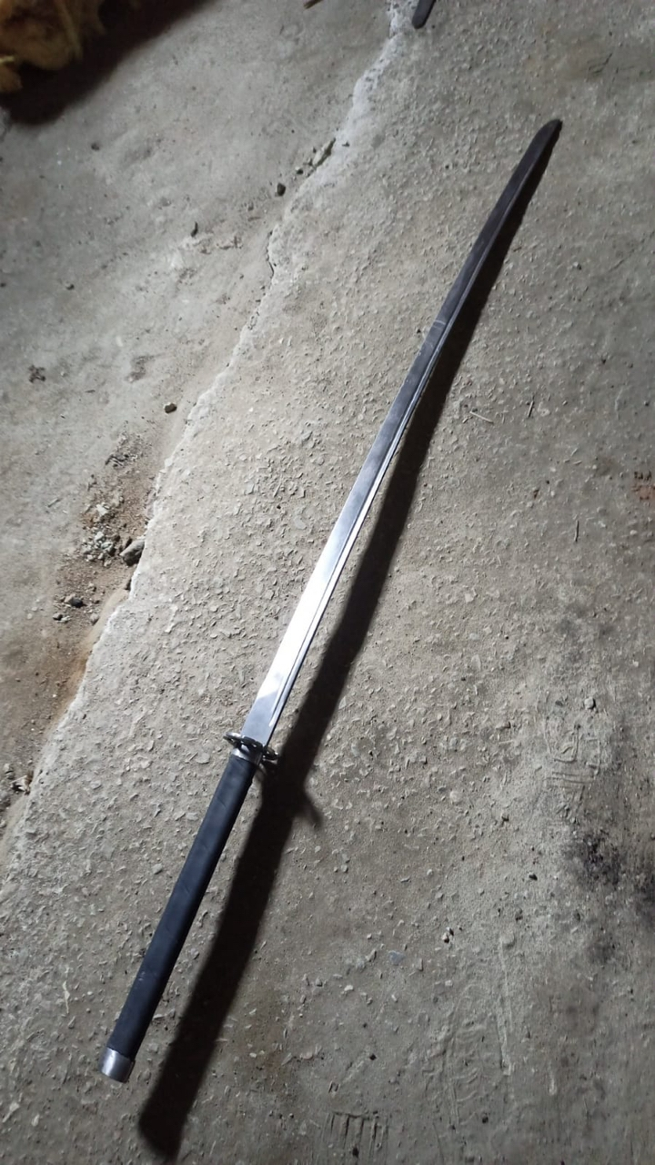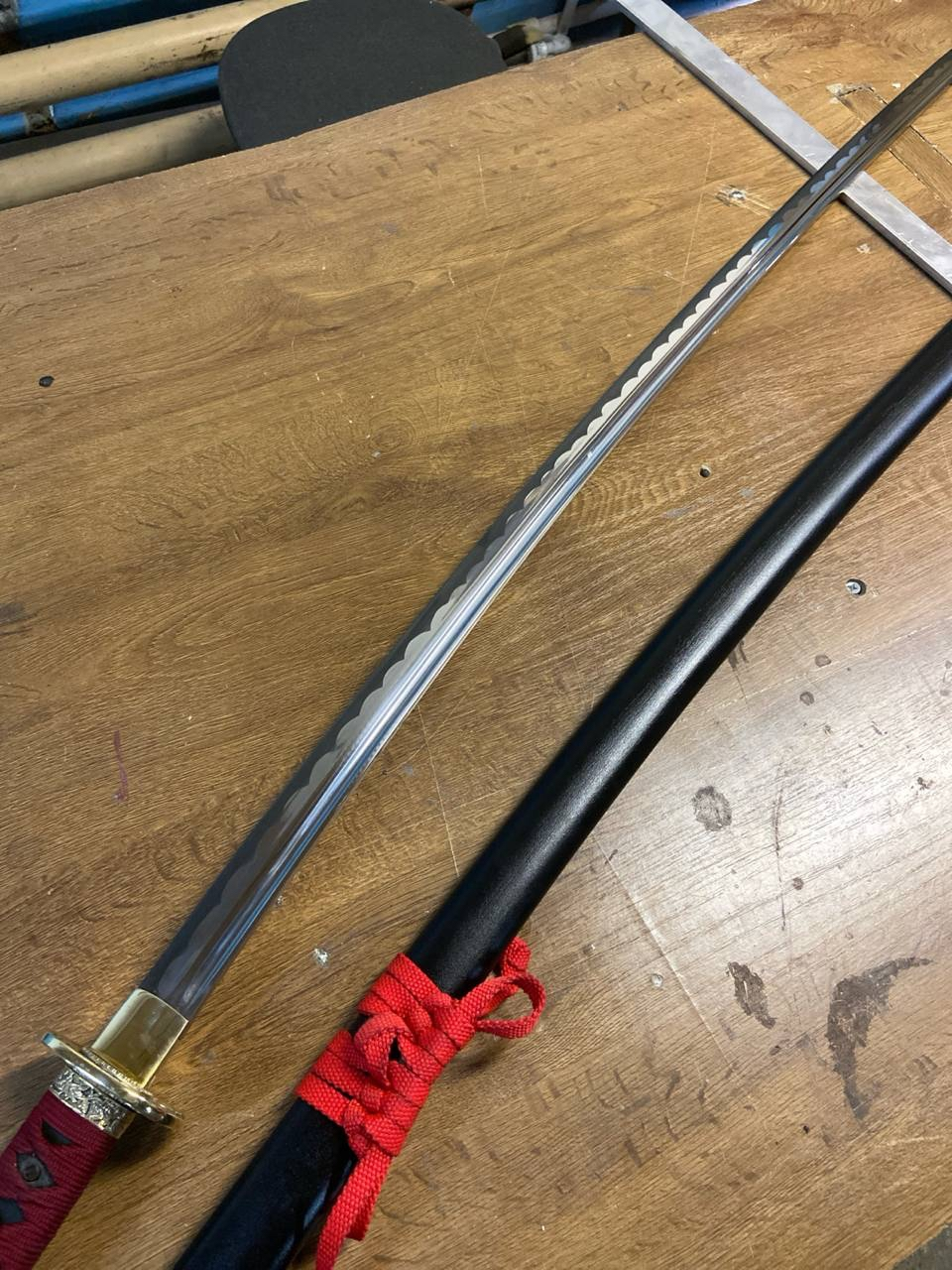 Алсо, тогда же заказывал тренировочный, чисто в додзё спарринговать и наколачивать удары, без оплетки и ножен. Он обошелся в 3k всего. Основная цена это литье из цветмета, полировка клинка и ножны.