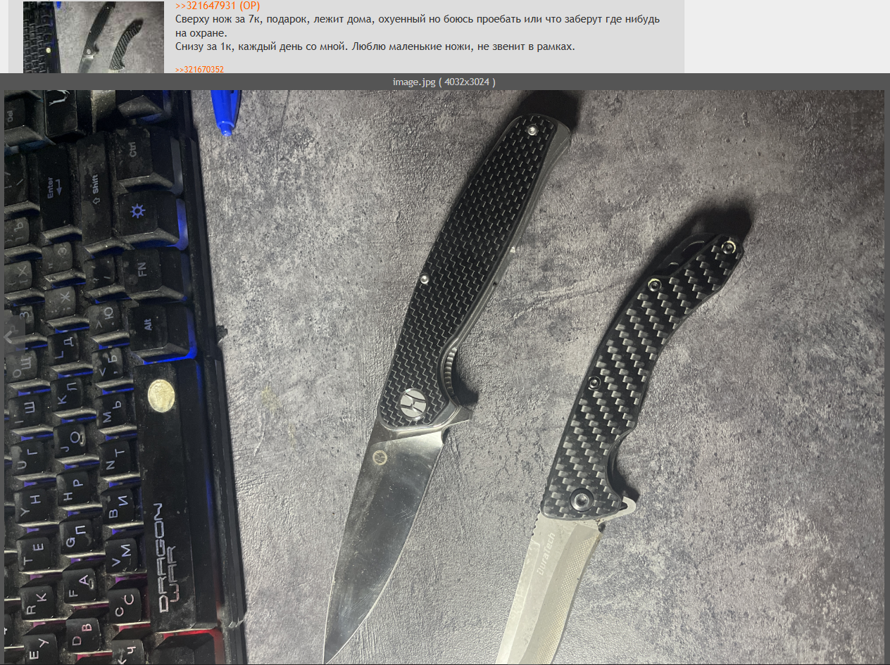 >>986780 >Ну что ты опять со своей палью из ануса дядюшки Ляо. Как будто что-то плохое, не будь пукнутым. Тем более что ОК-81 это оригинальный нож. >За 10к вон на Озоне можно взять кайзер Кайзер плох тем, что он всегда делает коротышкины ножи в 7см клинка. Нахуй оно не нужно. Научились бы делать 89-100мм был бы другой разговор. Но у них 90% ножей нихуя не такие.