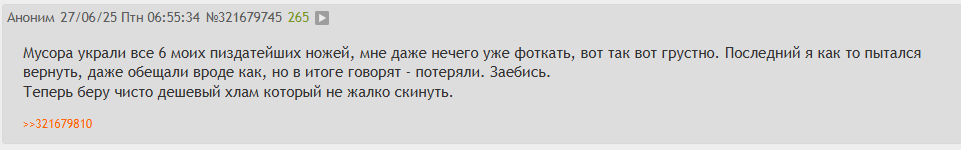 >>988488 Ну как бы да, он прав про глубинариев и посудомойки. У меня все с кем я общаюсь либо вообще не берут ножи в руки, либо режут ими по тарелке, соскребают еду с доски режущей кромкой а не обухом, кидают в раковину, кидают в посудомойки и прочее и прочее. Только 1 чел вроде понимает как надо и не надо делать