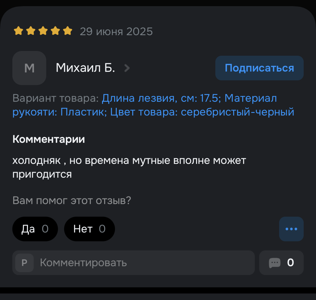 Ну шо народ? Очередной обзор? На этот раз тот, что выбрал в жопу раз. Ещё один доггерр, купленный по скидке за менее 3к. Приходит в стандартной коробке, которую я порвал ещё при открытии. Так же как и с мелким, ощущается дешевизна китая, но не то чтобы сильно. По качеству доебаться даже не до чего. Клинок довольно тонкий, остриё деликатное, можно обломать если хуйней заниматься. Геометрия резучая, в качестве первого ножа заебись пойдет. Ну и в офисе нарезать салатики, да пироги-тортики резать.