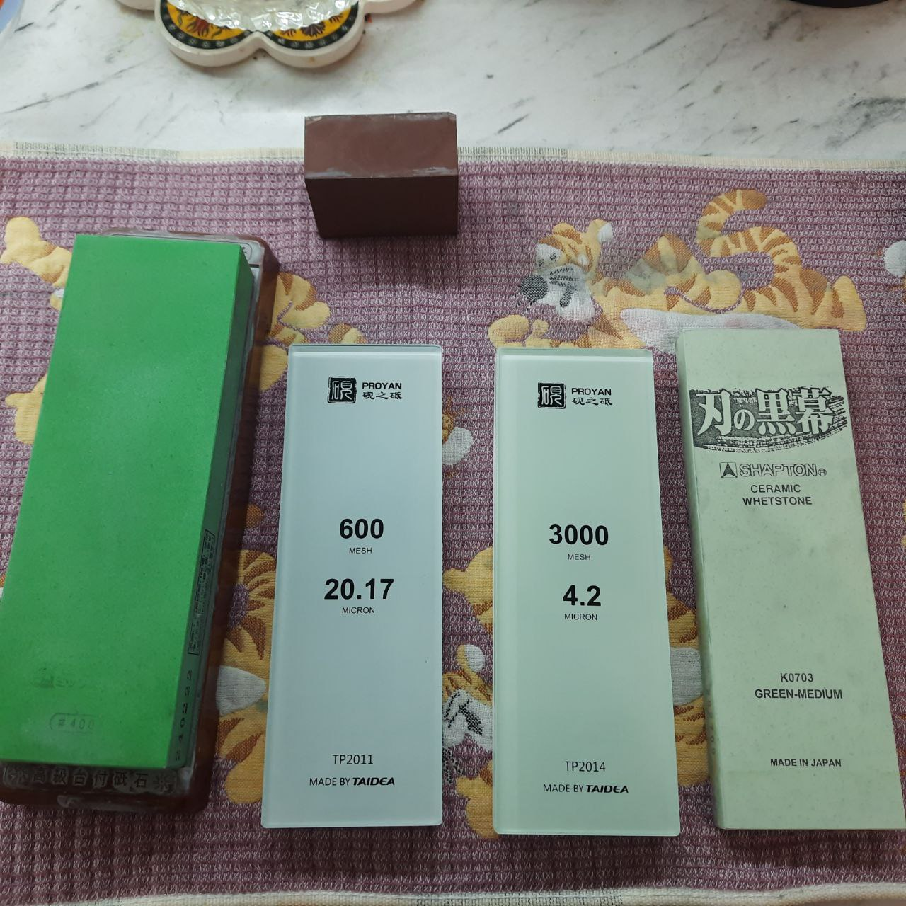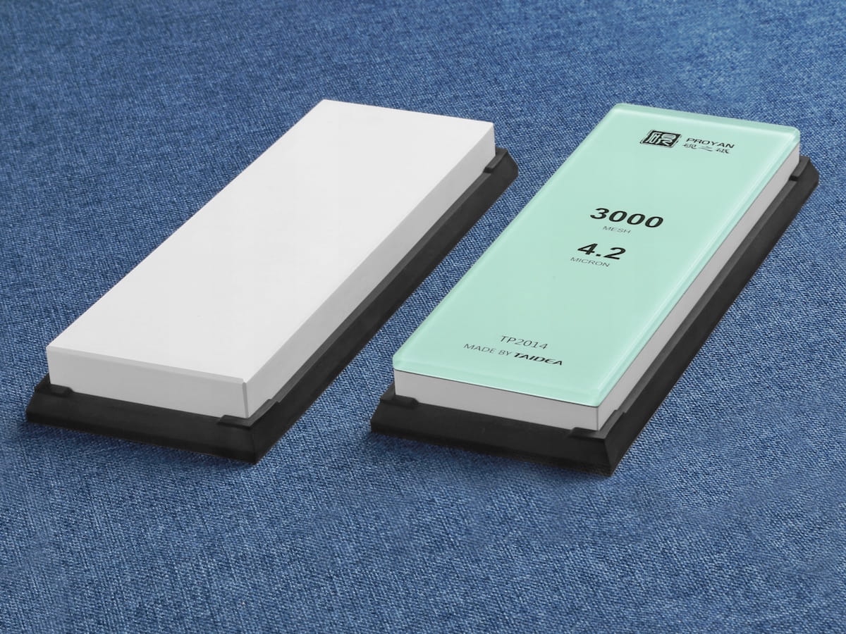 Купил попробовать китайские бруски Taidea Proyan 3000 TP2014 и 1000 TP2012 с новым процессом. Хорошо, годно. Электрокорунд белый WA в твёрдой связке, блок на стекле, геометрия рабочая искаропки без допиливания, загрязнений материала нет, высокая плотность, можно не замачивать, а поливать водой сверху и сразу работать, зерно стабильное по размеру, соответствует номиналу, хорошая эффективность съёма. Если сравнивать с японскими водными камнями из того же ОА WA, нанивской чосерой, то они... как будто даже не хуже, но это надо попользоваться несколько месяцев, чтобы наверняка утверждать, может там подводные камни, так сказать. Сравнивая с купленным давно бруском Taidea из ОА, скажу, что они сделали большой шаг вперёд. У старого камня разброс размера зерна, имеются небольшие контаминации, номинал не соответствует, вода проваливается как в решето. Предварительно, вся новая серия камней Taidea TP20XX - годные.