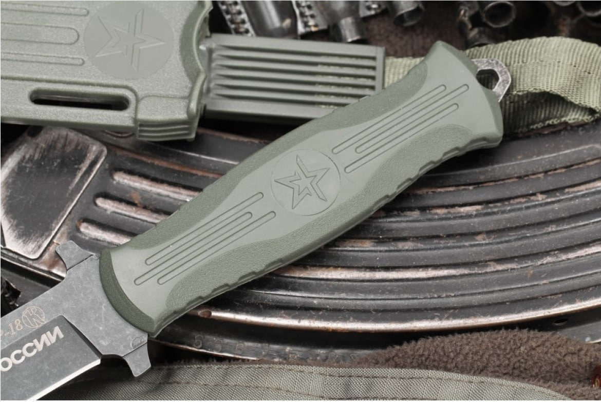 НР-18 нож всё-таки бюджетный, из того что мне не понравилось: Эластроновая ручка (на ощупь твёрдый ластик) пришла уже немного побитая, видимо будет биться дальше. 2. Текстура лезвия идёт полосочками. Изначально сильно бросалось в глаза, сейчас чуть меньше. 3. Ножны стукают края рукояти и за пару открытий уже есть следы. Вообще говорят что ножны неочень. 5. Сильновыпирающий "стеклобой" кринж, мешает ударом с ладонью на торце/навершии/пятке ножа.
