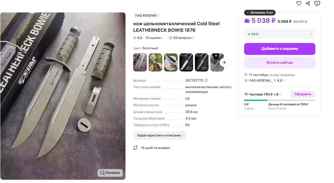 Захотелось заиметь здоровенный нож боуи, чтобы рэмбо изображать у себя дома. Нашёл на озоне пикрил реплику cold steel leatherneck. Но разве холодняк на маркетплейсах так можно продавать? В чем подвох? Или если он как-то выведен из разряда холодного, то за счет чего?