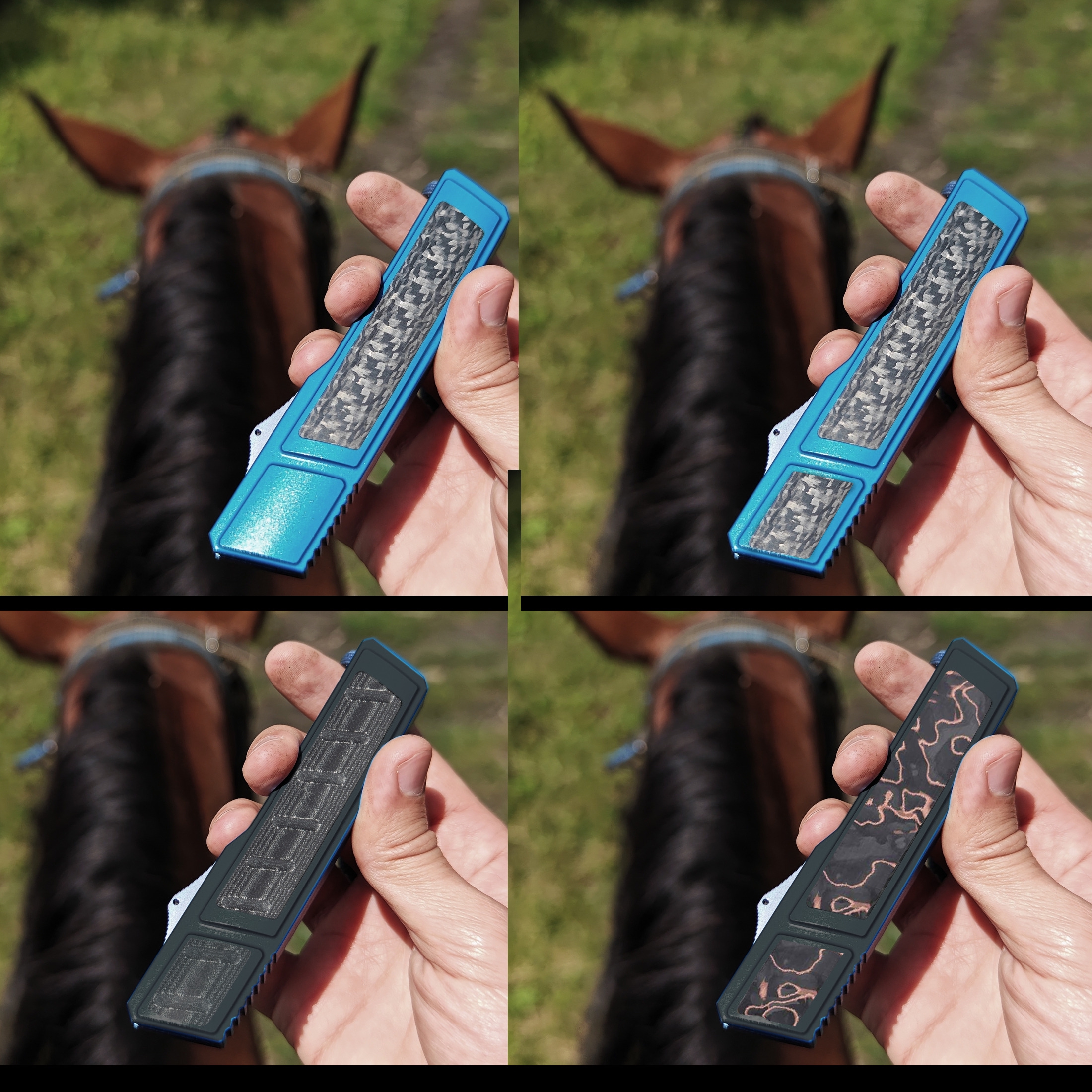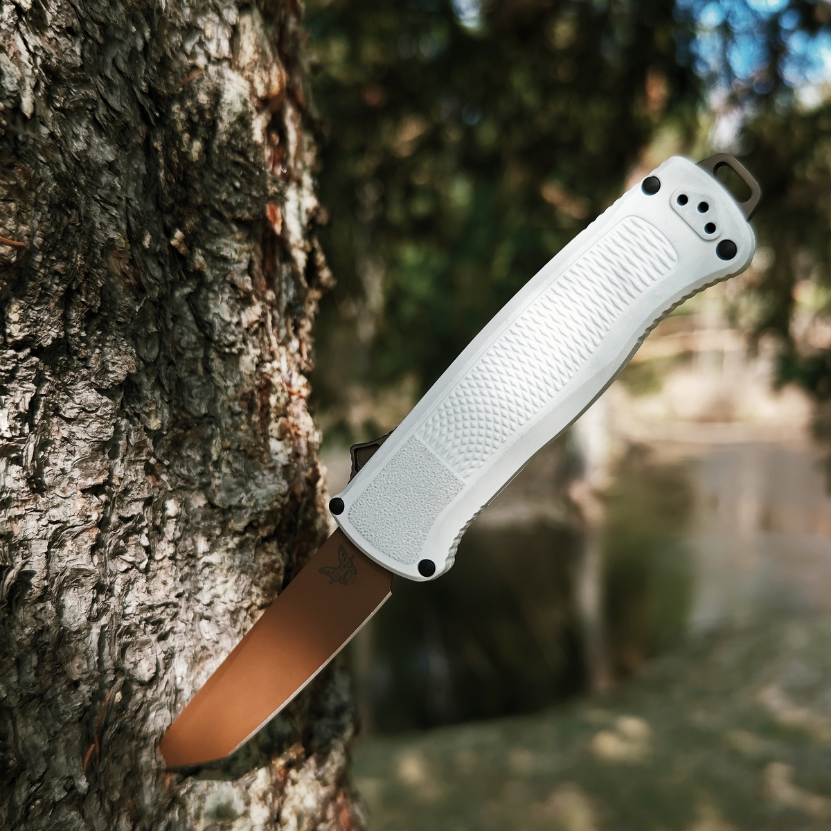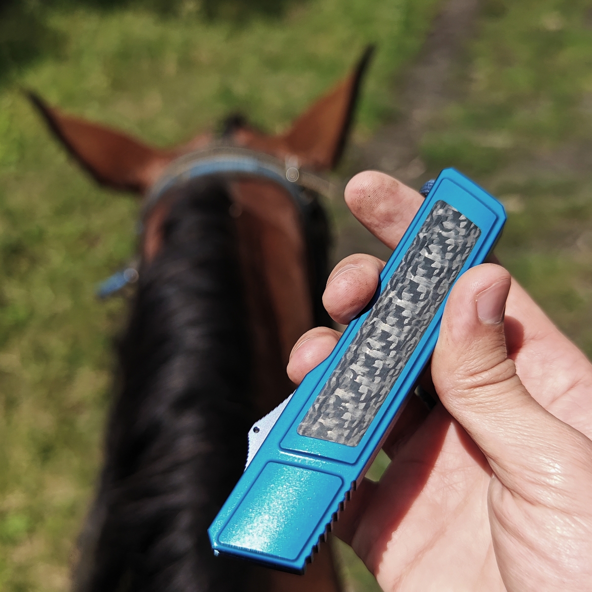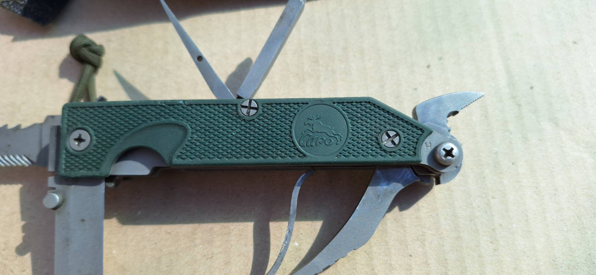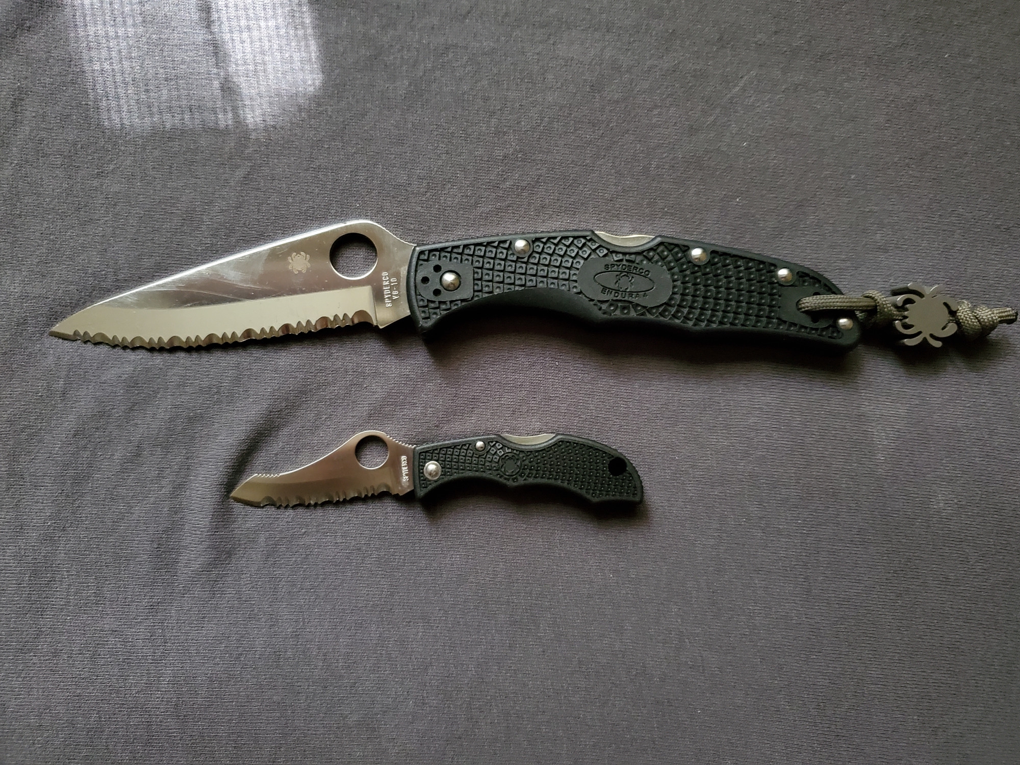 Теперь сравнение с китайским клоном. 1. Ячейки плетения g10 крупнее, но у китая более шершавое. 2. Внезапно клинки разной формы. У орига лезвие сужается к кончику, из-за чего: а) имеет более хищный вид; б) визуально выглядит меньше, из-за чего сам нож выглядит чуть меньше, и рукоять визуально доминирует по размеру; в) в теории будет лучше втыкаться. 3. Естественно разные шпеньки. 4. У орига все вырезы g10 более угловатые, у китая более округлые и плавные. 5. По механике у орига лучше выбрасывается клинок, чуть мягче ход. У китая видимо злее пружина, когда закрываешь, на середине закрытия она срабатывает и резко пытается оттяпать пальцы.