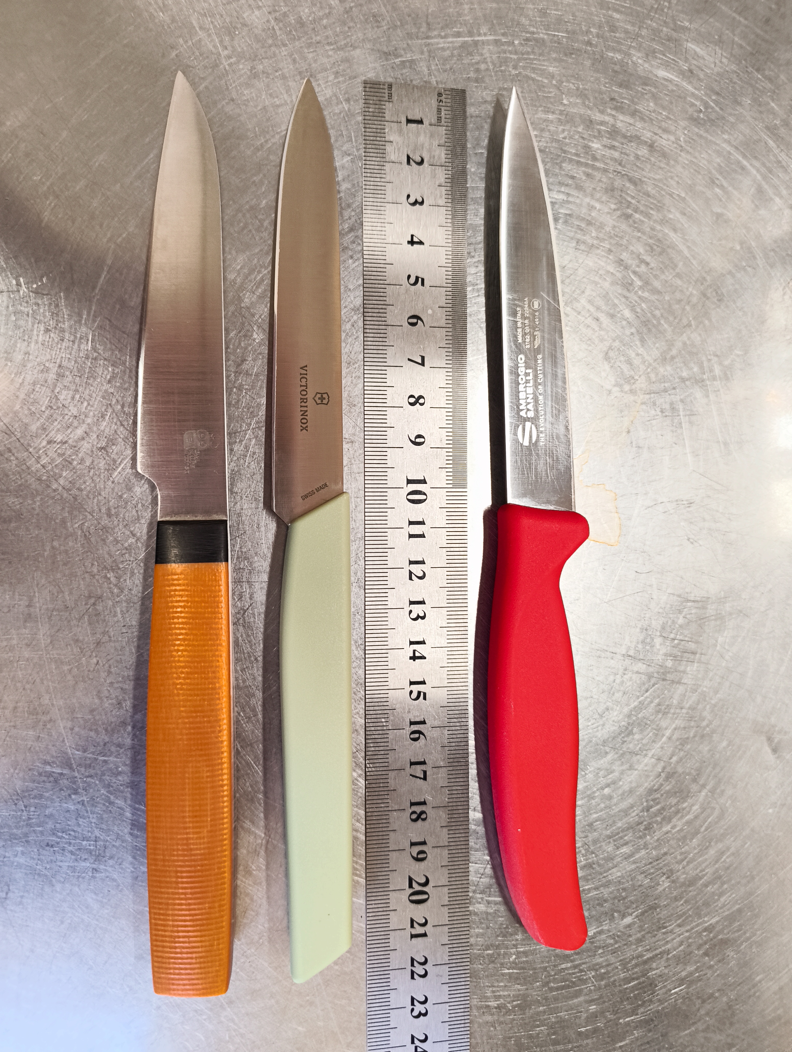 >>993733 Если ты почти не готовишь, то достаточно одного утилитарного ножа 13-16 см. Минимальная поварская тройка обычно закрывает все потребности, если ты мало готовишь. Но если ты на кухне (даже домашней) полный цикл - разделываешь рыбу, мясо, птицу, снимаешь кожу, филе, делаешь тонкую нарезку готовых продуктов из куска и так далее, то куда удобнее, если у тебя есть специализированные инструменты: Помимо мелкого овощного коренчатого стандартной формы удобнее иметь "овечье копытце" с прямым лезвием. Вогнутые "клювики" не обязательны, прямые "клювики" могут быть альтернативой копытцу. Если ты разделываешь тушки и в принципе работаешь с мясом-рыбой, то шкурник, обвалочник, жесткий филейник, гибкий филейник для рыбы и шпиговочный. Плюс топорик. Как вариант, если чаще птицу, то один японского типа гарасуки, мини-кирицке или хонесуки для всех задач. Для рыбы и птицы крупнее - стандартный набор из дебы и жёсткого слайсера или янагибы. Как вариант, жёсткие слайсеры можно заменить одним узким шефом, хотя это не так удобно. Сантоку или иной широкий нож со спрямлённым лезвием для шинковки удобнее еврошефа. Гибкий слайсер универсален в том смысле, что им и нарезку удобно делать, и шкурку с рыбы и овощей снимать о доску. Хлебная пила в общем-то не нужна, разве что ты часто печёшь и есть задача делать напилы свежевыпеченного хлеба с твёрдой толстой коркой и нежным мякишем.