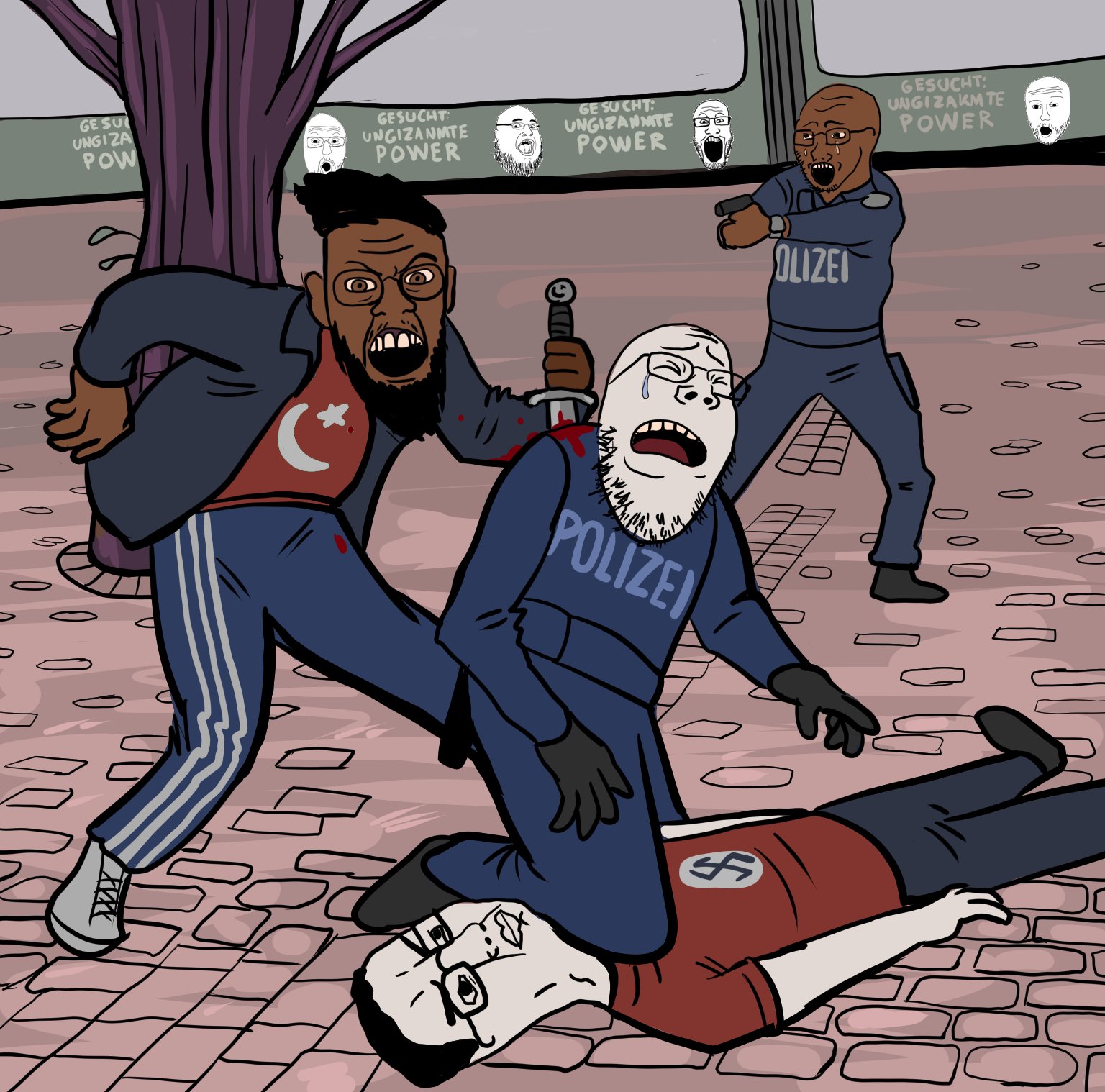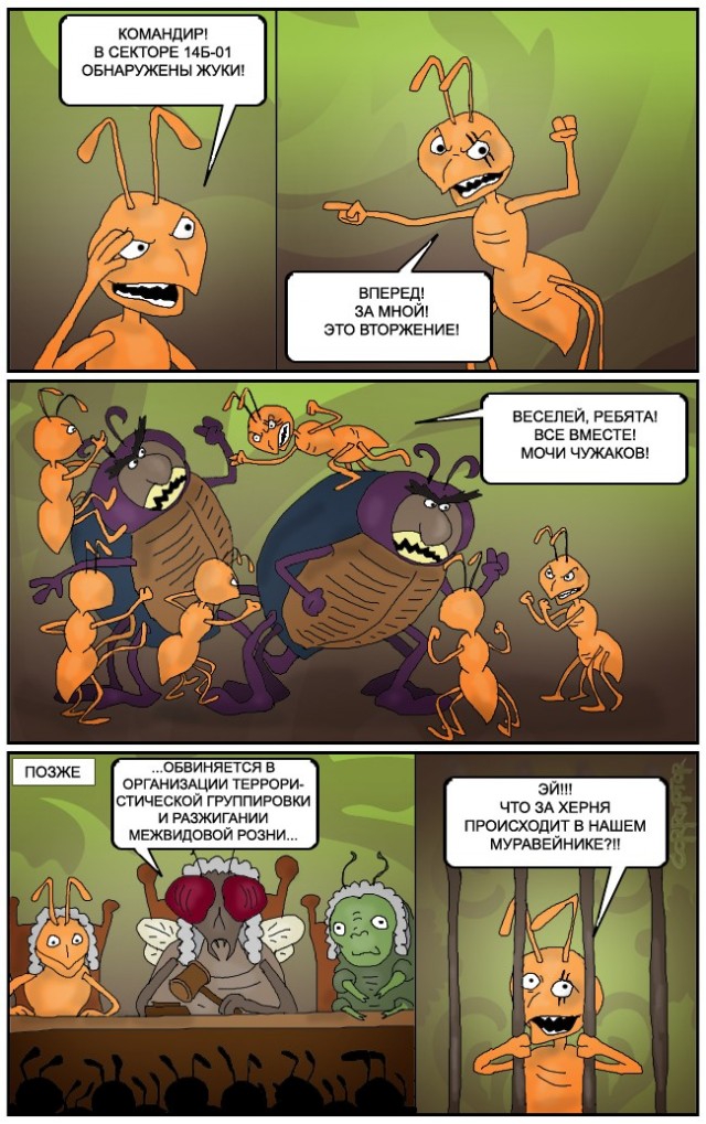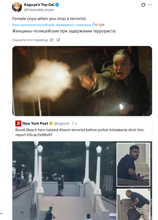 Забавно, что герой хоть и смел, но не на столько, чтоб забыть про пирамидку австралийского мира, и ебнуть обезоруженного бабаха его же оружием. Он твердо, на уровне подкорки знает, что те же менты, которые в панике стали пацифистами-гуманистами, очень строго спросят с него за все, когда опасность минует. -А не превысил ли он пределы самообороны? Ведь тот, кто секунду назад был террористом, теперь стал безоружным, и перестал представлять опасность? -А не действовал ли он из мотивов розни и неприязни? Не был ли он НАЦИСТОМ, хуже Гитлера, когда убивал бедного Абдулу? -Не хранил ли он дома ЭКСТРЕМИЗМ?