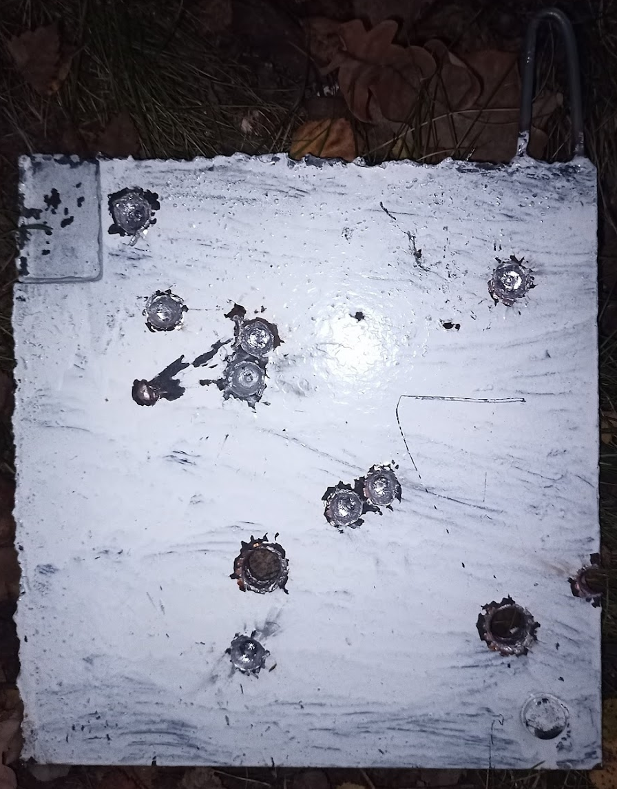 немножко о прочности материалов, или почему делать гонги из ст3 - плохая идея (о чем я предупреждал автора, но он хотел проверить. почему бы и нет, патронов не жалко... :)) толщина - 10мм. первый отстрелян с 50м, второй - со 100м. 9х19 - держит. 5.45х39 - условно держит... отметины 5мм глубиной, сзади выпуклости по 3мм. даже для такого калибра - гонг получится практически одноразовый. 308 - ну лол, чо.