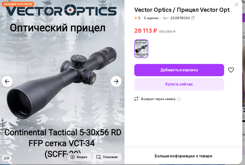 >>997482 хз, не помню. вот прямо тебе - да. бери континенталь с золотистым логотипом на боковом барабане и будет всё ок. и не стесняйся. выёбуется на ф классе своим сваром только тот кто купил свар и продолжает ходить жалеть потраченных денег когда видит такое же но дешевле у других. Vector Optics Continental 5-30x56 FFP 34mm VEC-MBR (SCFF-41)