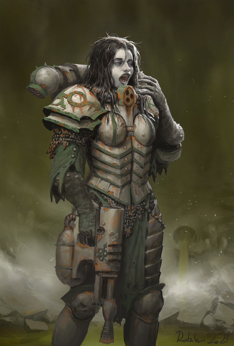 >>1140644 (OP) >девочки-нурглитки в голове (да, фан персонаж, мне не стыдно) и хотелось бы оставить ее худо-бедно ебабельной Как-то раз, лет 10 или 11 назад, вроде бы вскоре после выхода Tome of Decay по Black Crusade, пилил по фану всяких персонажей, потенциально в качестве НПС для будущих игр. Накидывал я их по правилам создания игровых персонажей, вестимо. И вот среди них родилась у меня забавная нурглиточка с планеты Мессии во внешней части Вопящего Вихря - планеты не особо сильно покоррапченной на фоне миров ближе к его центру. С эдакими приключениями в духе Мэд Макса в кишащих мутантами палящих пустошах, с бодро сражающимися с ними (и друг с другом) бандами на собранных из говна и палок байках и технике. Здоровенная, крепкая девка, двухметрового с копейками роста, комплекции примерно космодесантника, хоть и без доп.органов и генетических улучшений, одетая в с трудом добытую легкую силовую броню, с цепным мечом и автопушкой, раскатывающая по пустошам на кастомном байке в качестве чемпиона одной из групп охотников на мутантов, работающих на одного из тамошних drill baron'ов. В маске, подающую несколько видов ядовитых паров тамошних боевых веществ. Поскольку к Нурглу она только-только обратилась (взятый ей продвинутый архетип по базе был андивный, а за взятые ей дополнительные таланты и умения она уехала к Дедушке), ни о каких гниющих кишках и паразитах речь еще не шла, конечно. Из даров Богов ей нароллилась парочка вполне безобидных и внешне не проявляющихся - Nerveless Ennui (очень сильно пониженная физическая чувствительность) и Warp-Touched (шиза, в ее случае - одна из нурглитских, а именно максимальная неряшливость, презрение и желание уничтожать все красивое и изысканное). При этом холодная, спокойная даже в бою, совершенно бесстрашная, из-за пониженной чувствительности вечно неудовлетворенная, но в основном смирившаяся с этим, хоть и страдающая. При этом грязнуля даже по меркам своей планеты, где с чистой водой все в принципе плохо,и с гигиеной тоже. Внешне, при этом, нароллилась отнюдь не уродкой, и никакого особенного спидорака в себе еще не несла. Когда нагенерил - стал сразу представлять, какие у нее там буйные заросли везде, и прочий imagine the smell в тех редких случаях, когда она все-таки снимает свою броню (например для ремонта) после пары недель непрерывного ношения - и прямо шишка встала. Да и сейчас встает, когда представляю, лол,но я тот еще извращенец-андив, который в свое время играл и слаанешитами, и нурглитами на столе. Хотя, по сути, вышла просто фем-версия нурглитского марина на минималках. Потом в играх ее использовал как НПС.