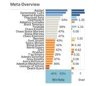 Итак, первая статистика от ГоВе. С нерфами эльдар и генокульта. В студийном обзоре отметили 1) Скилл так же важен и просто за эльдар сейчас играет больше скиловых игроков, потому что всегда нравились бек и миньки. 2) Мета ещё не устоялась и просто игроки не за эльдар и ГСК пока не нашли сильные комбинации своих юнитов. Так же сказали, что балансить будут стараться не правилами, а ценами юнитов.