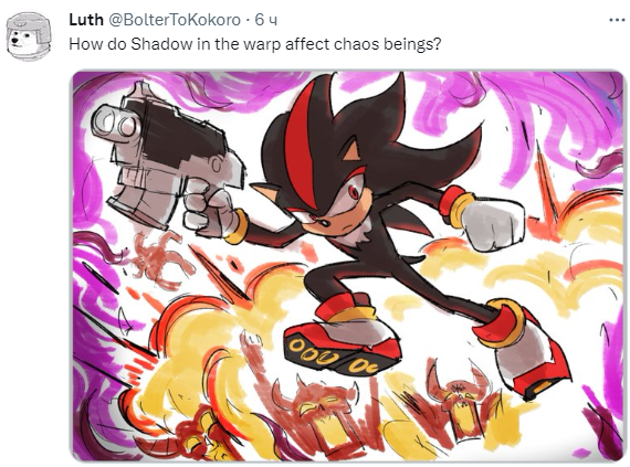 >>1062514 Не настолько конечно, но сониковские персонажи в мире вахи (по крайней мере Соник и Шедоу железно) от всего, что меньше примарха скорее всего мокрого места места не оставят. Это как минимум гиперзвуковая скорость передвижения и боя, что наверняка любого космодеса превратит в кровавое месиво (ломали роботов в несколько раз больше титанов класса "Император"). На демон-принца по силам вполне потянет суперформа. В большинстве случаев. На максимальном известном пределе, который показали ежи, скорее всего уже уровень богов хаоса, если не выше (зависит от интерпретации), потому что суперформы бились на равных с Солярисом, который чуть не сожрал всю мультивселенную.