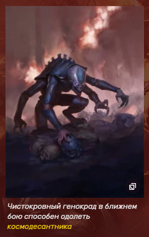 >Мне показалось, что для настолько чужеродного ксеноса, по сути являющегося скоплением беспозвоночных без сложной нервной системы, подобная эмоциональная окраска кажется странной Согласен. Подобное можно ожидать от человека или эльдара (как бы они не пыжились, но повадки у них зачастую вполне сопоставимы с человеческими), но не от подобной хтони. Но подобное можно по дойлиански списать на косяк автора.
