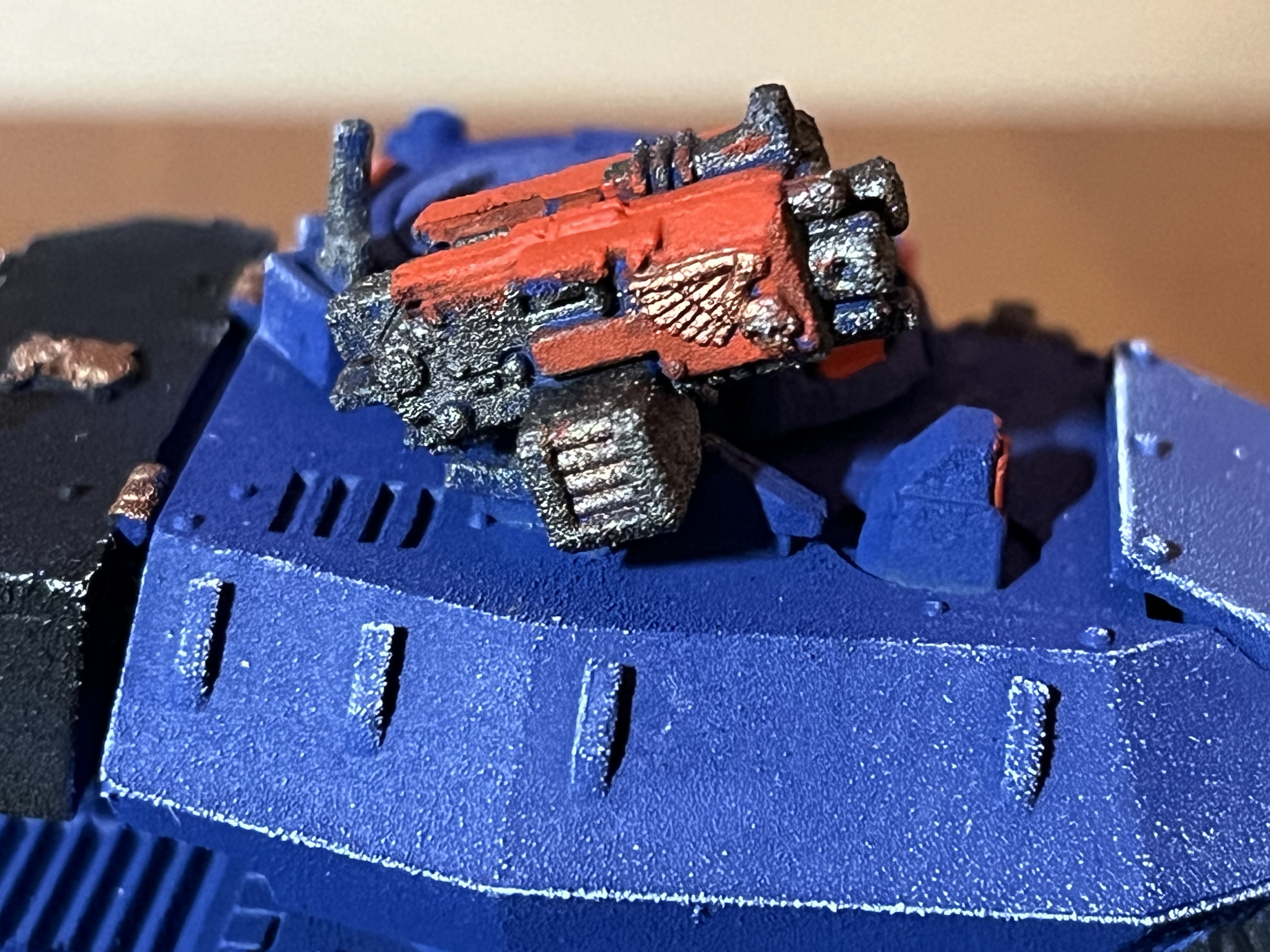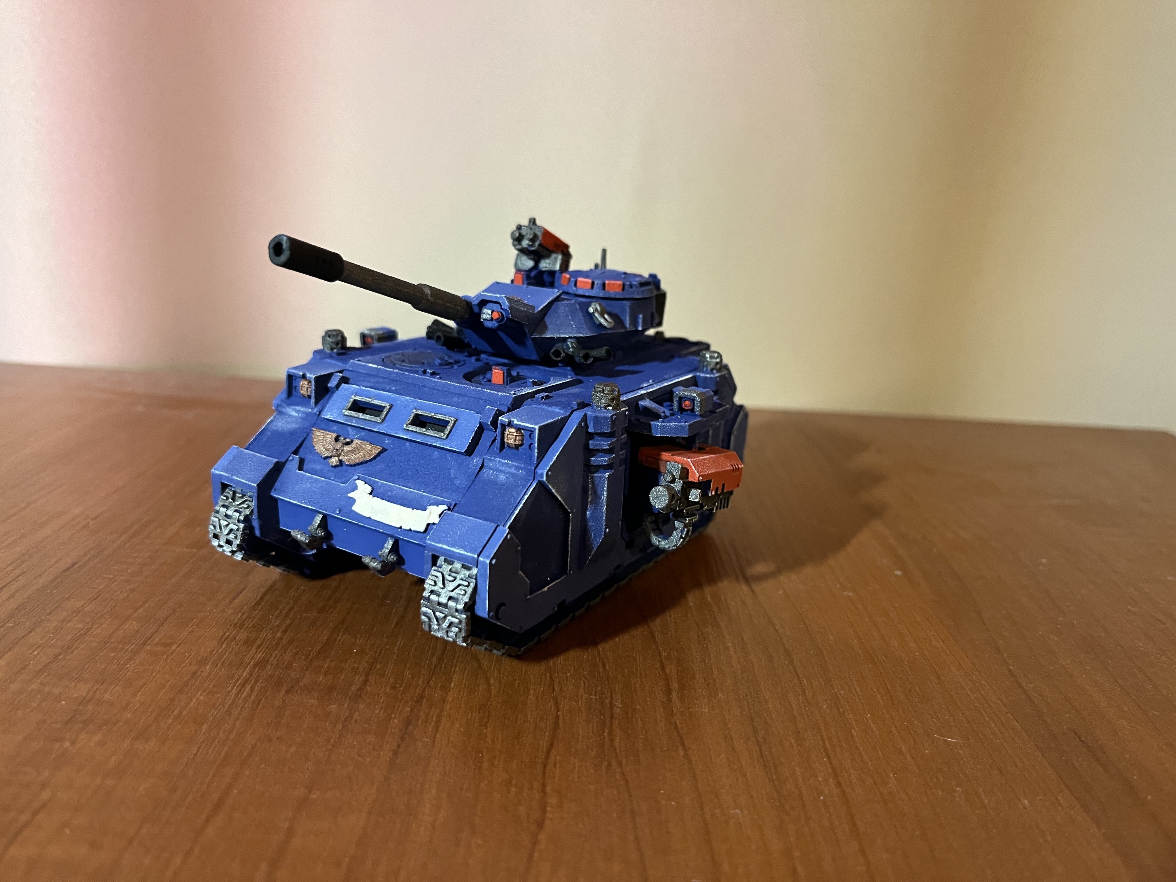 Готов, красавец. Драйбраш вышел, имхо, гораздо аккуратнее, чем мой первый опыт. Облажался я только с проливкой, да болтер спаренный на башне вышел неряшливым, там сложно было его красить