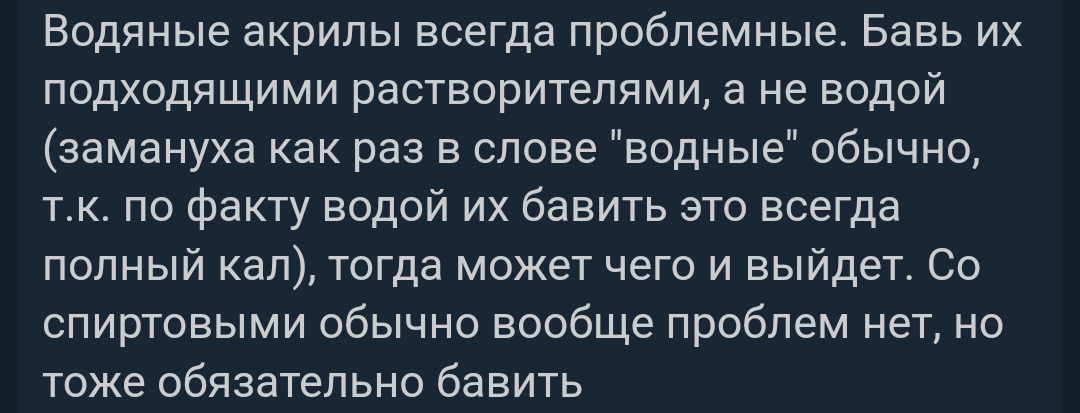 Претензии к худакрилу пропадают когда базу дудкой хуяришь имхо, решается его главная проблема с не самой приятной укрывистостью и нежным желанием оставлять чиркаши мазки. Потом поверх когда уже им работаешь всё идёт збс.