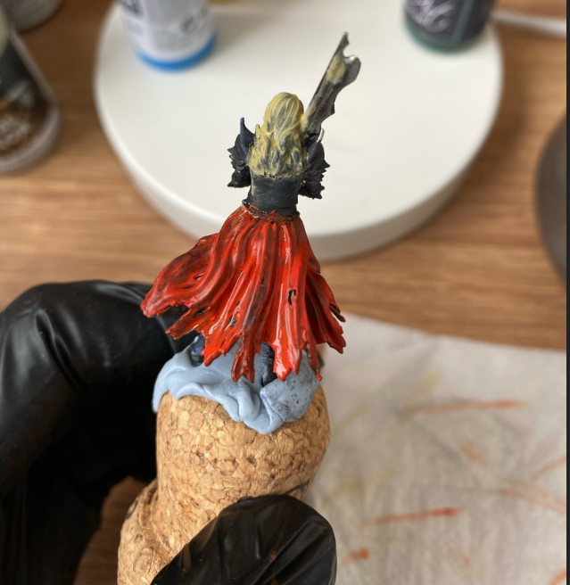 Еще с ночи и щас немного мучаюсь с основным слоем. Проблема в том, что я стараюсь разбавлять краску до очень тонкого слоя, чтобы не целый слой краски был на перчатке и при нанесении на саму миньку получается слишком тонко и часть краски просто перетекает ниже и уже там становится более плотной на общем фоне.