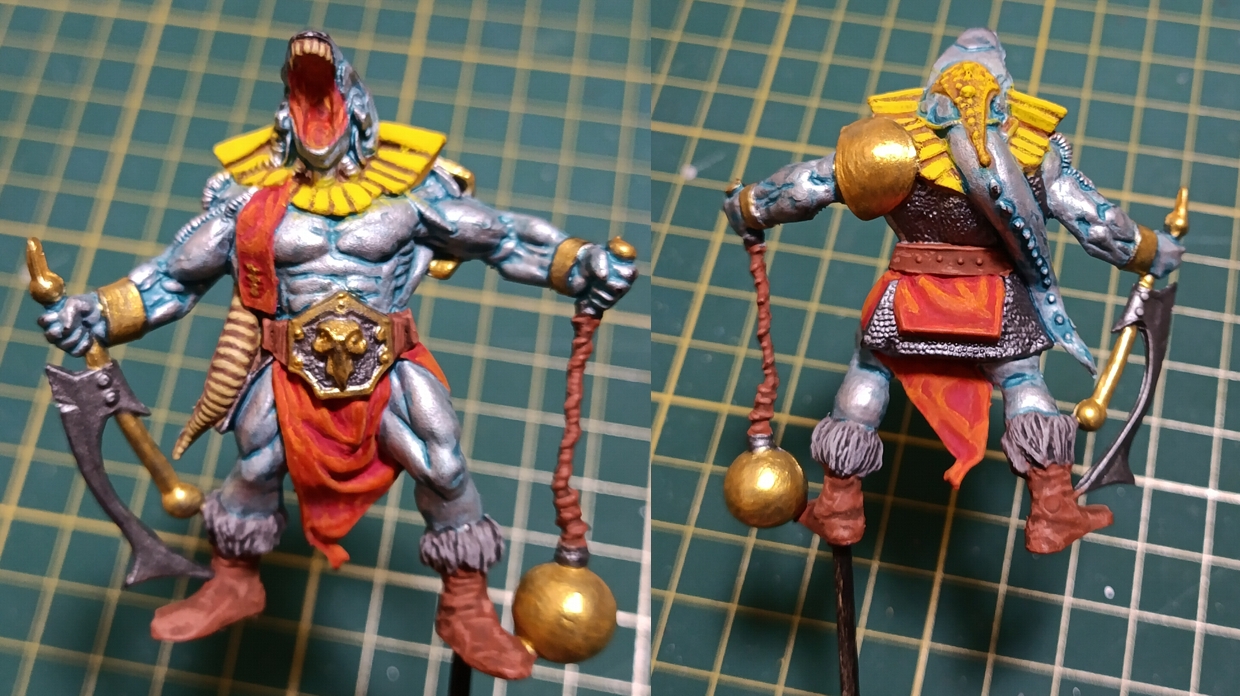 Руны на тряпках всрато получились, но там мои компетенции всё. Символы имеют слабый рельеф + он дополнительно стерся слоями краски. Проливка жиновато на гребне хвостов получилась, может подправлю а может нет. Ну и на кончиках этих же гребней краска сошла, потому что руками хватался.