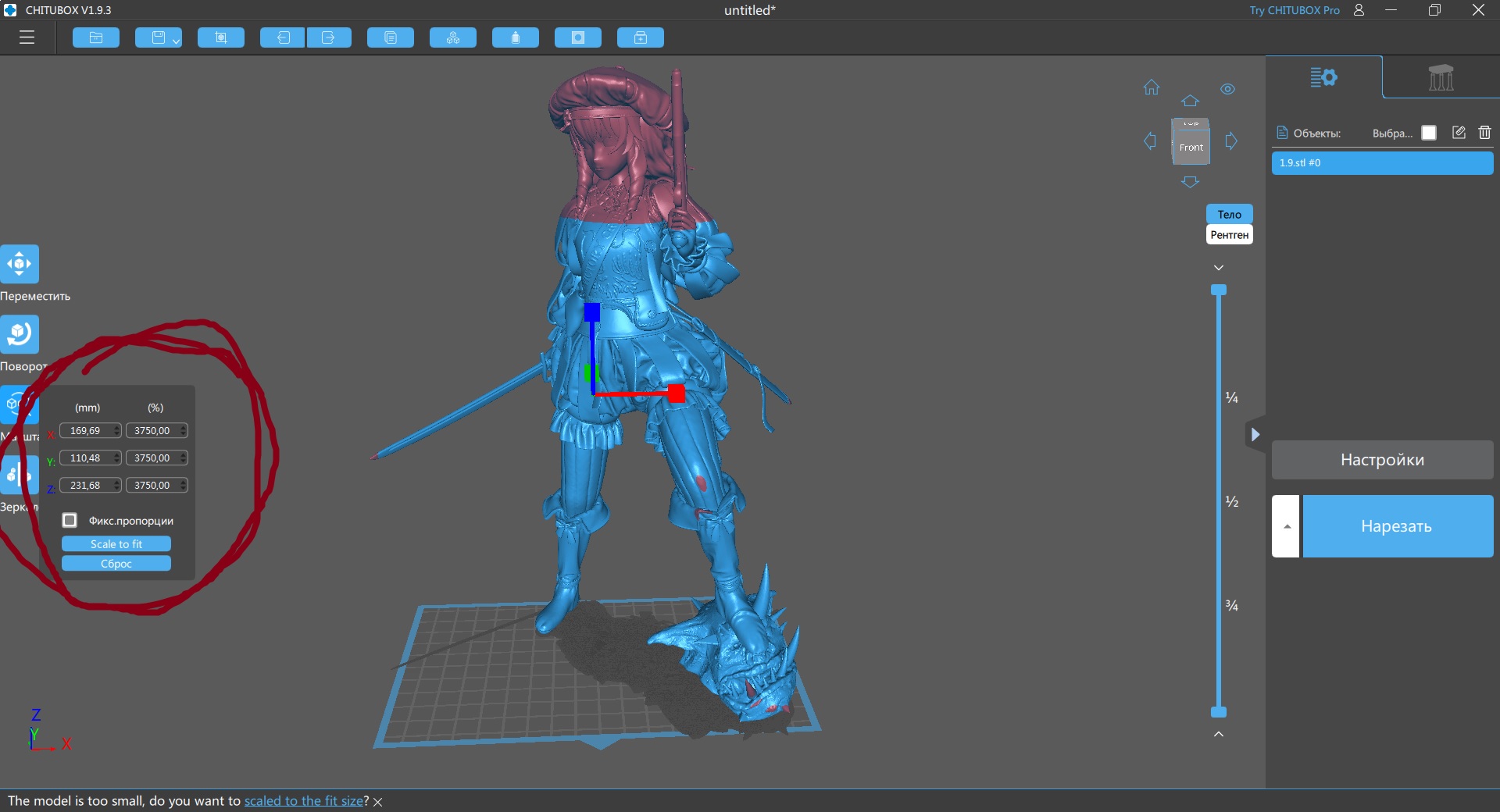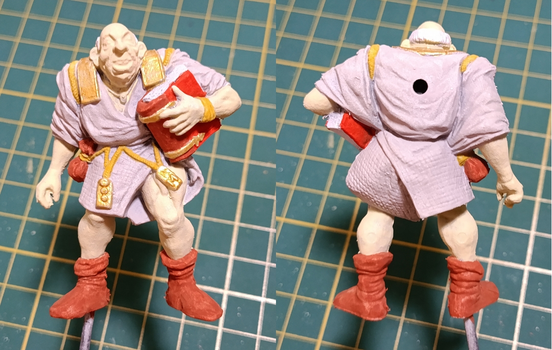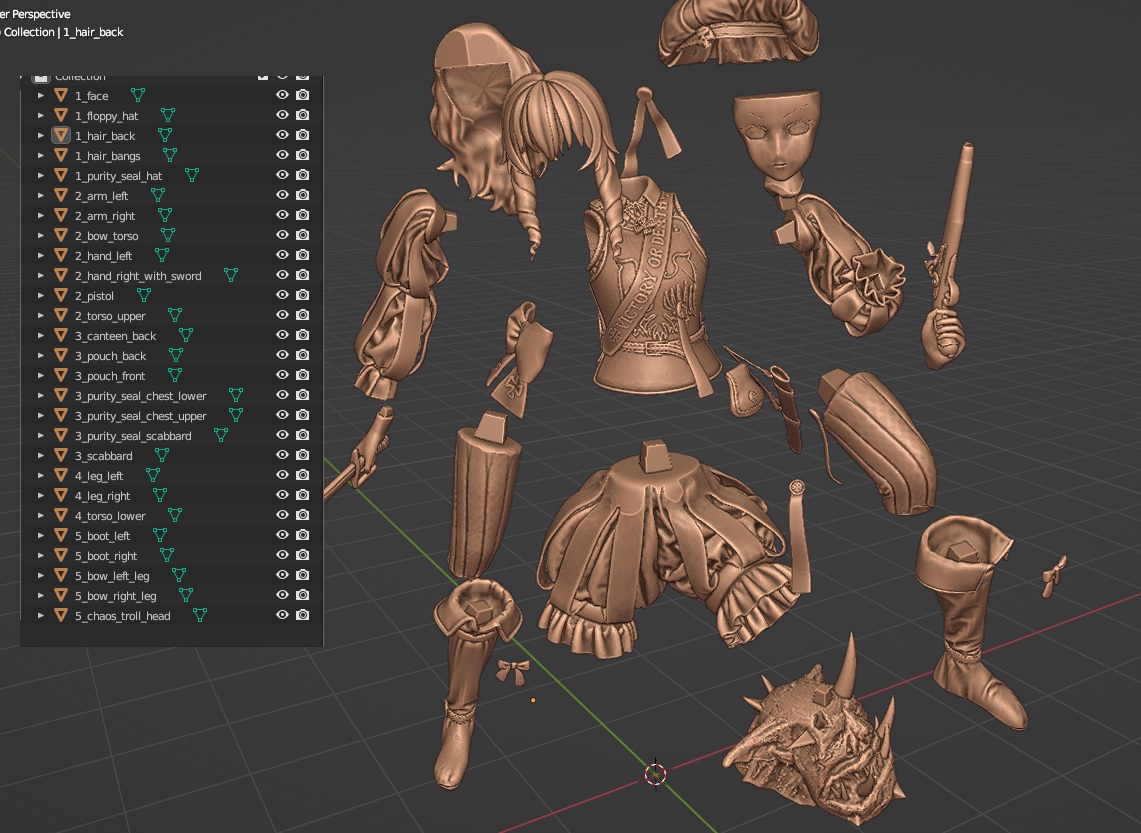 есть нюансы: 1) портки шапка и левая рука имеют много мелких складок на тряпках которые мешают хорошо на печатном столе расположить деталь. напечатать можно, но обрабатывать тонны суппортов будет потом неудобна. 2) пистоль и ладонь две разных части, я думал удобнее красить так будет. технически рукоять вставляется в ладонь, я поэтому печатал по отдельности. практически я нахуй разломал все пальцы на руке и содрал всю детализацию с щёчек рукояти ствола пытаясь пистолет ей в ладонь запихать, печатай всё вместе одной деталью. да неудобно подлезать кистью будет, но хоть ничего разъёбывать не придётся. 3) я конкретно хуёво слепил шевелюру сзади. текстуру вьющихся волос кистью накарябав можно вытащить хоть какой-то вид, но если по японской школе красить всё в монотон закатывая будет как откровенный кал говна смотреться. 4) шея с трудом со скрипом встаёт на своё место в ворот рубахи. паз уходит глубоко, поэтому перед я стачивал края шеи шоб нормально вставало 5) печатай тесак по возможности из прочной смолы. мне было впадлу менять смолу и я всё из своей любимой Resione M70 нахерачил. сама по себе она топ, ебейше любую детализацию вывозит. но она очень мягкая пиздец и рубило свернуло нахуй вертолётом, сколько не пытался его под кипятком выправить его только ещё больше винтом ебало 6) по изначальной задумке нога должна была быть на башке троля, но он получился настолько уёбищным что я поменял на камень когда собирал базу. можешь покрасом попробовать вытащить из этого говна хоть какой-то вид конечно, я быстро сдался и пошёл по пути наименьшего сопротивления. 7) в блендере она супер-маленькая, когда лепил мне так удобнее было со всеми модификаторами работать. при печати ставил масштаб в 3750% в слайсере. она теоретически наверное в полтора раза меньше всё ещё нормально распечатается, но если совсем меньше крутить масштаб то по толщине детали будут слишком тонкие и бородой вся пижня пойдёт.