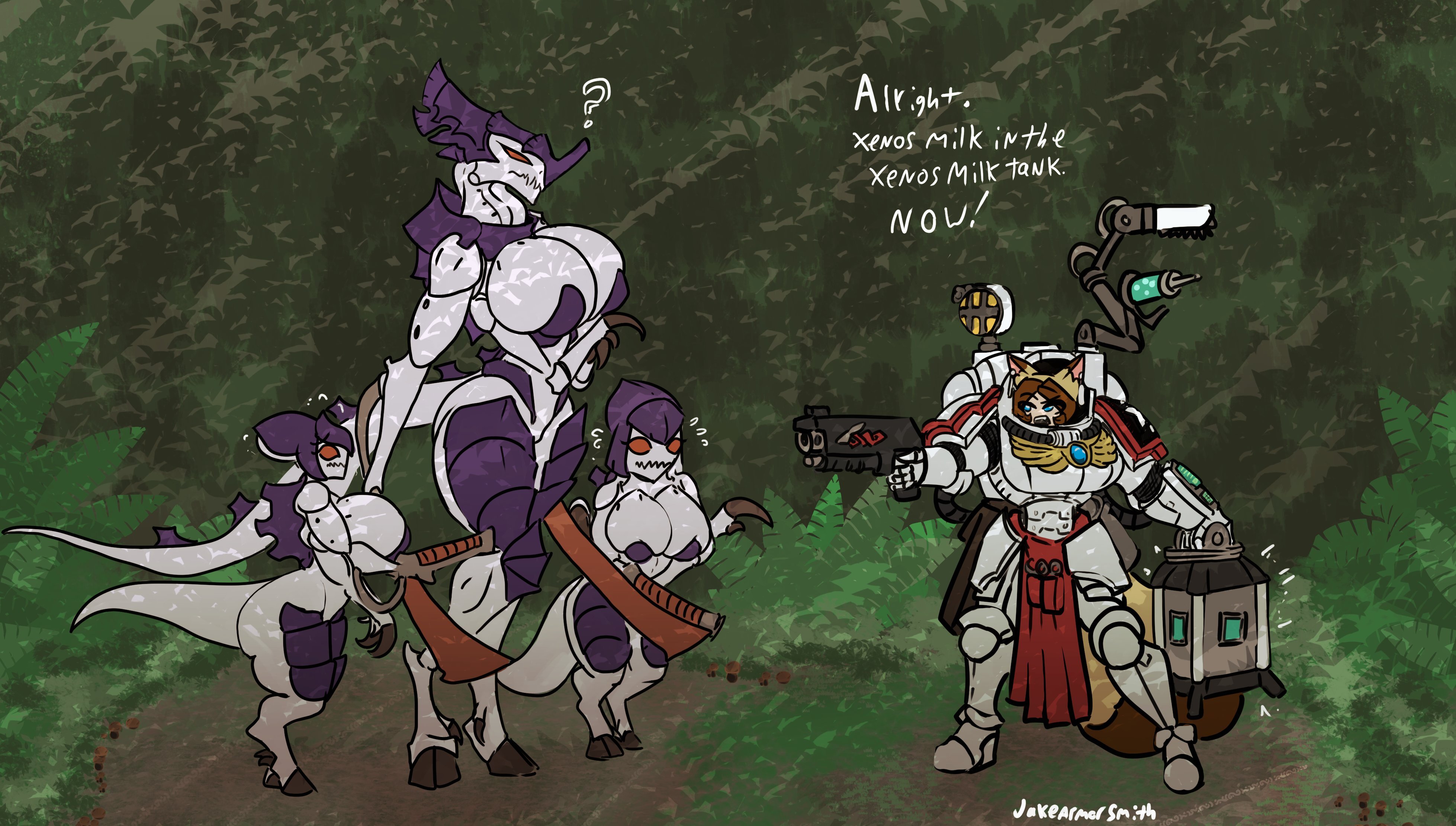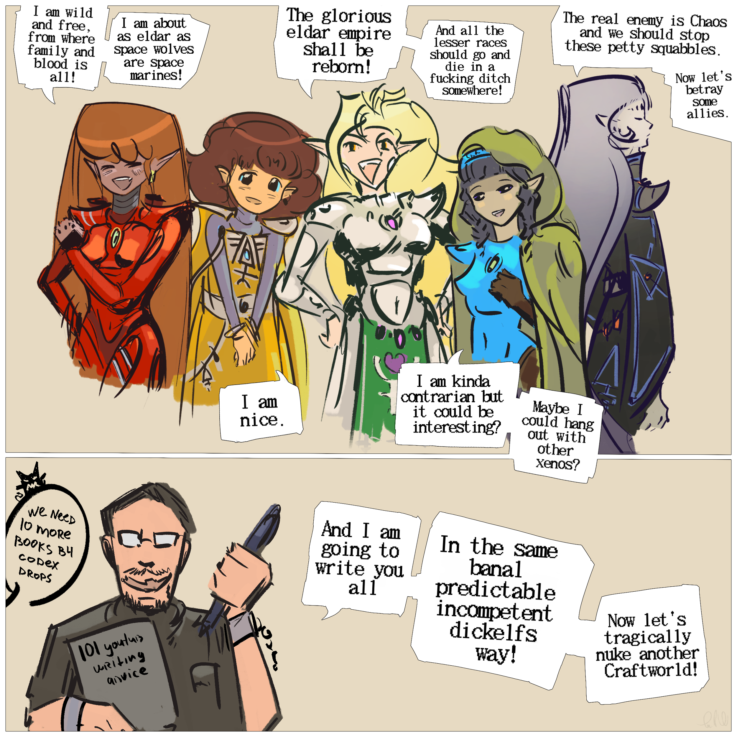 >>1109319 >А чем заняты скваты кроме того что они просто существуют и почему то находятся в секторе ксеносов? Как стереотипные гномы - копают ресурсы, чтобы делать клёвые штуки. Просто живут, у них нет глобальных целей типа восстановления империи как у некронов, распространения идеологии и захвата лебенсраума как у тау и т.д. Когда ёбнул Разлом, у них навернулись торговые маршруты и многие колонии, поэтому они стали выползать за пределы ядра, чтобы свою экономику восстановить. Всё это с гримдарковым душком хищного капитализма, когда гнумы могут расхуярить населённую планету на части, чтобы легче было недра потрошить.