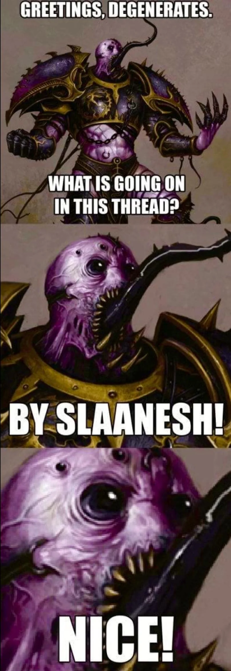 >>1109319 Ну ВКП обосрался их завоевывать в галактическом ядре, даже подгон новых силовых доспехов Марк 3 и тех смешных терминаторских доспехов не помог это ещё старый бэк. Ну Империум думал их съели во время вторжения Кракена(старый бэк), но в новом оказалось они нихуя не сдохли. Ну ещё они Демируги из БфГ как союзники тау тоже они, и в дремучем Бэкер были намеки что это старые добрые космогномы. Сейчас они полноценно вернулись как армия, завоёвывают ресурсы и жизненное пространство после вялого разлома