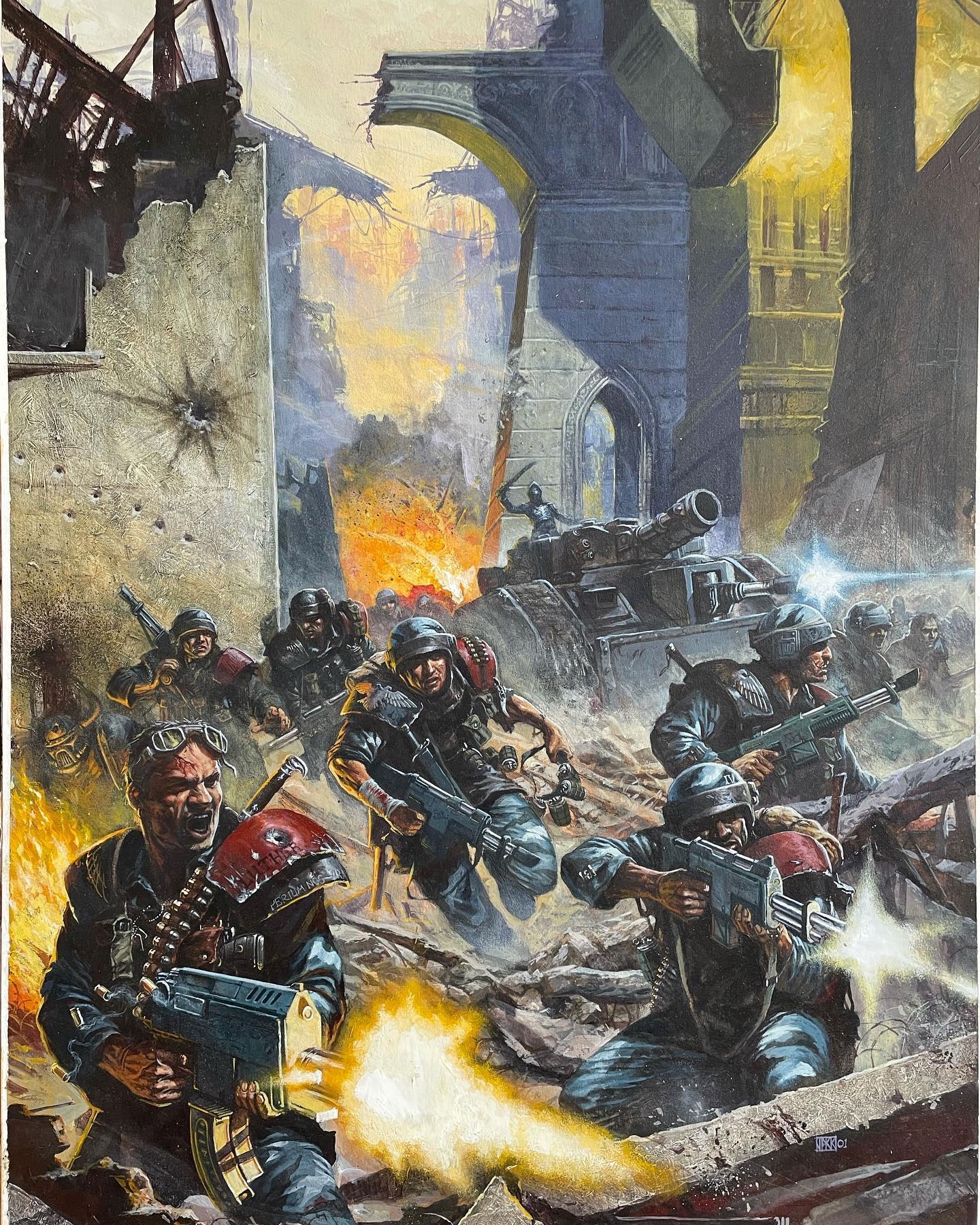 Насколько я помню, в старых редакциях упоминались болтеры для маринада и обычных хуманов как отдельные разновидности. Даже арты были официальные где гвардейцы с болтерами. Пикрил - обложка к дополнению правил времен третьей редакции.