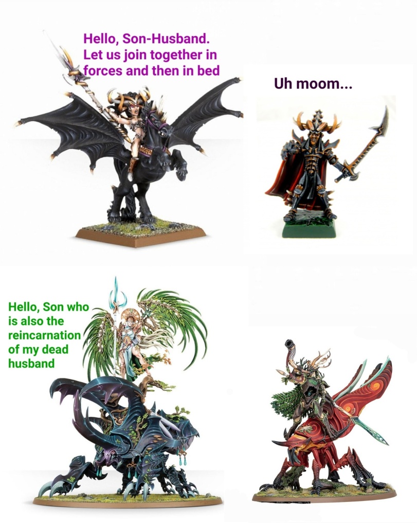 >>1109630 >Вечная Королева это забитая ханжеская хикка без политической воли. А нахуя ей политическая воля? Слуги есть, любимый ёбырь есть, целое королевство на ультуане является её доменом, так к тому же она живой аватар Иши. Вот политикой пусть занимаются короли фениксы и принцы ультуана раз именно они обосрались с Малекитом и ко, а так же начали войну с дварфами из-за чего эльфы потеряли колонии в старом свете, а колонии в Наггароте перешли под власть Малекита.