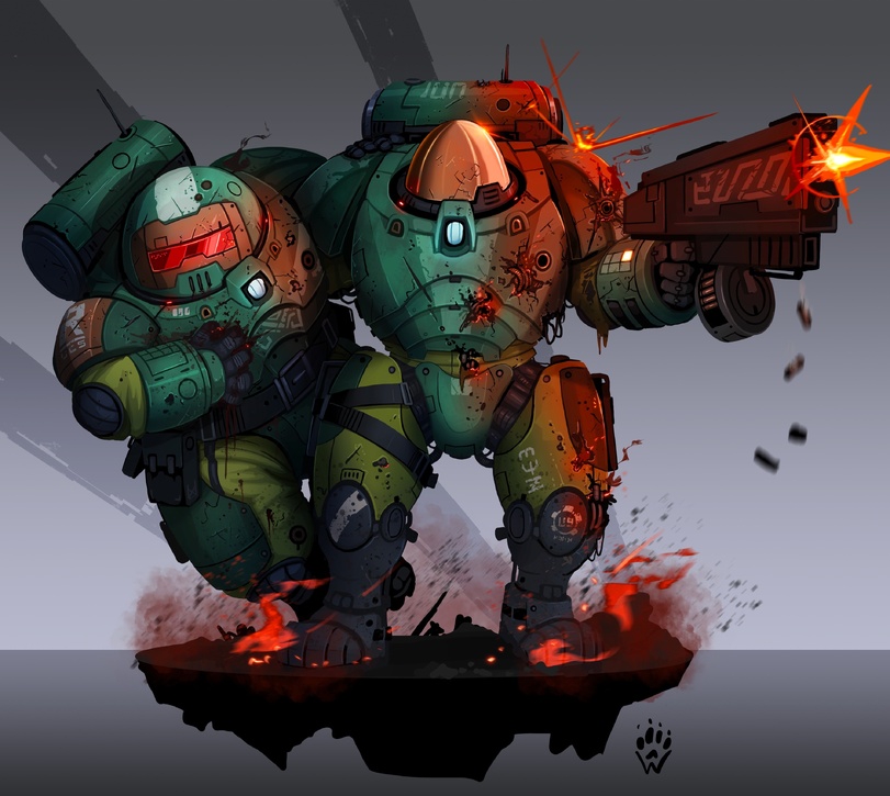 Момент из омнибуса Щит Ваала, где 20 термосов спустились на забитую тиранидами планету, и БЫЛИ БЕЗ ШЛЕМОВ В ПОЛОВИНЕ БОЕВ. Нахер им терминаторская броня, да еще и реликварная если голова не закрыта? там одной капли биокислоты в глаз хватит чтобы они померли. Тут дело даже не в кодексе, маленькая голова торчащая из доспехов термоса это скорее забавно чем эпично. Да и сомневаюсь что с такой орясиной можно управится без шлема. Все таки посложнее обычных доспехов
