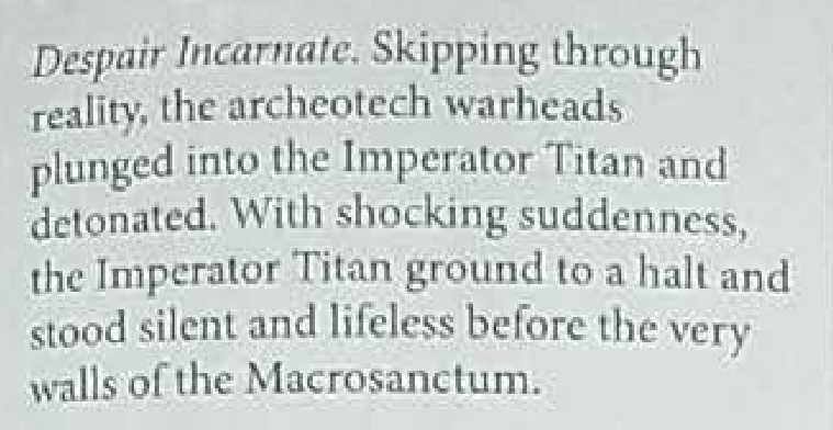 "The most sacred knowledge tells of an age of nightmare and death, when the very laws which bind the fabric of the universe were torn apart. This much we know - for twenty-five millennia Mankind ruled the stars, tamed them, enslaved them. Wonders beyond imagining were commonplace and no miracle of techno-arcana was beyond us. Our worlds were silvered jewels that glittered among the firmament, and we held in our hands the means to sunder reality itself or to remake it to the mould of our thoughts." - Adeptus Titanicus Rulebook (2018)