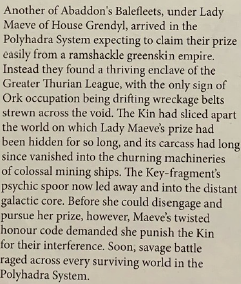 >The north western fringe is ravaged by the Apostles of the Blind King, rogue Tech Priests who view humanity as an affront to the Machine God. The Apostles uncover wondrous artifacts lost in the Dark Age of Technology that allow the creation of supernovae from the heart of living stars. >Constellations are forever changed as the Apostles purge the outer Segmentum Obscuris. War rages for a decade, until the Navigator Joyre Macran discovers the palace-warship of the Blind King hidden in a fold of Warp Space. Escaping, with his knowledge, Macran guides the Emperor-class battleship Dominus Astra to the palaces location. The Blind king is killed when the Dominus Astra's Lance batteries pierce the palace-warships hull, and without his prescience the Apostles are overcome. >- 5th edition Rulebook