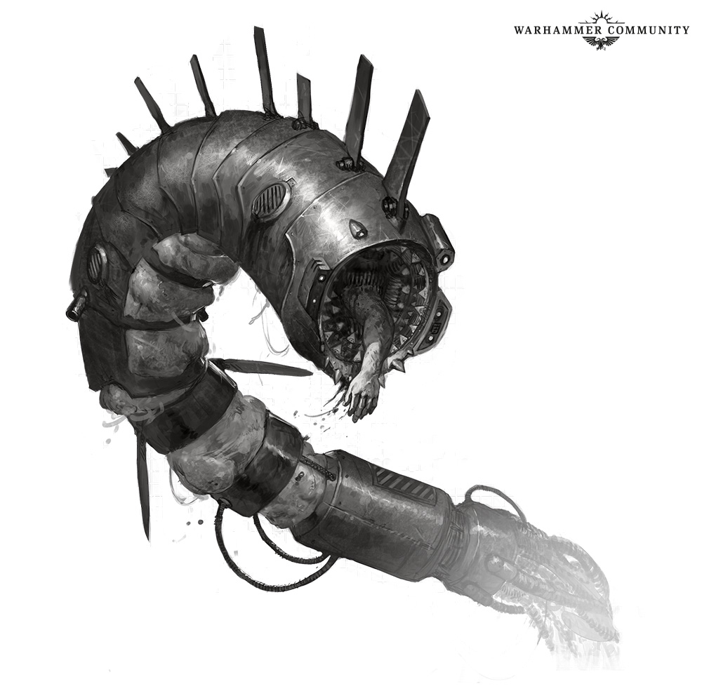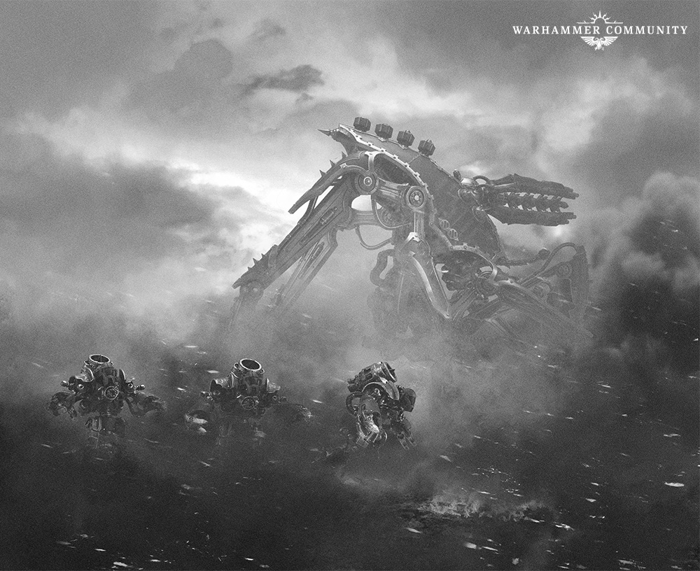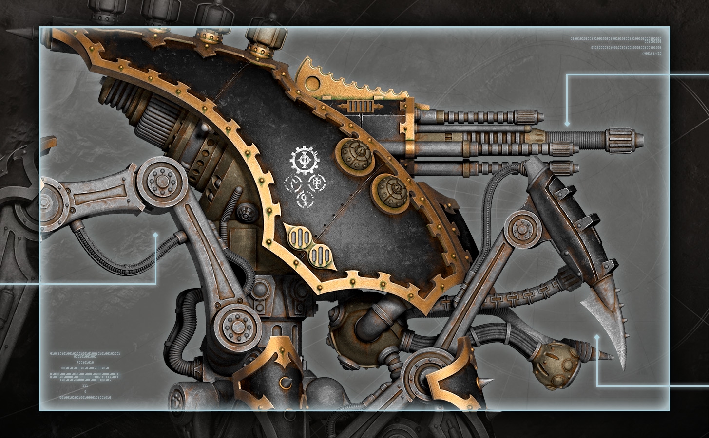 Вся работа началась с вопроса "А что если Механикум потеряют берега?". Воевода Гор разрешил своим железякам использовать забытые и проклятые знания, а также подключаться к Варпу. Нужно было создать эдакую предтечу к тачилам Хаоса в 40К, поэтому все силуэты должны были стать колючими, тонкими и страшными.