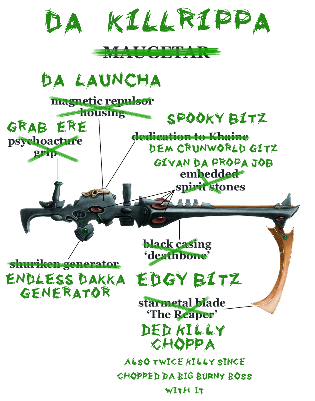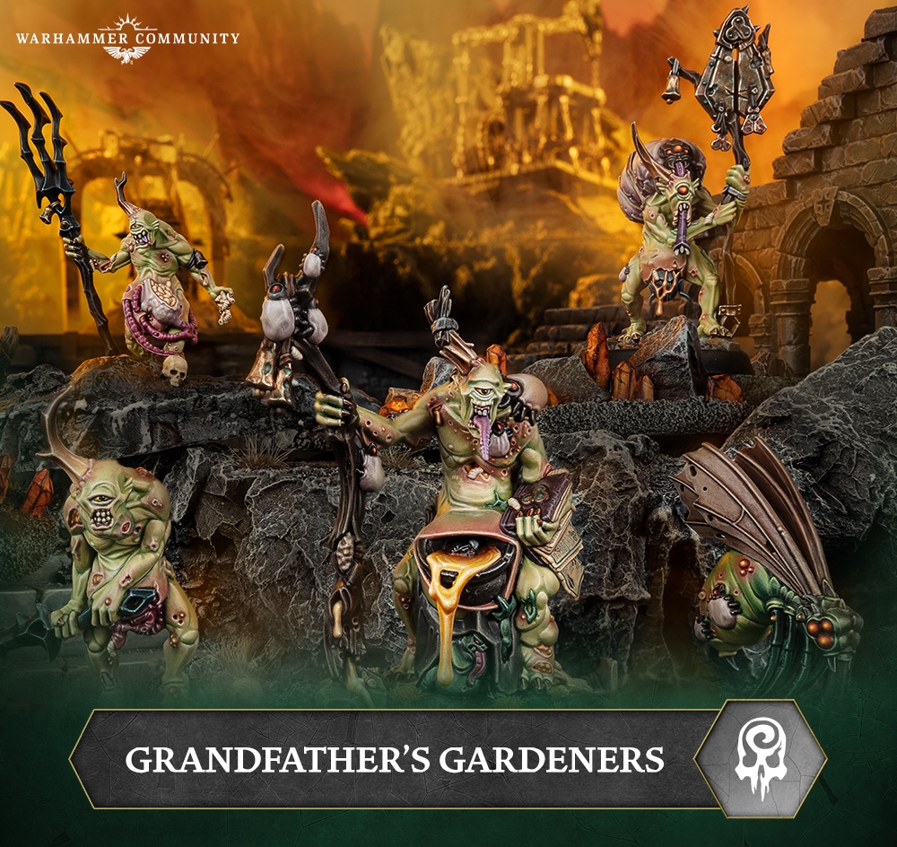 - Глумспайты получат обновки в виде расширения модельного ряда Гитмобов, сейчас есть только отряд на волчарах. Поговаривают среди них будет переосмысление Дум Дайвер катапульты. Будет армисет под релиз.
