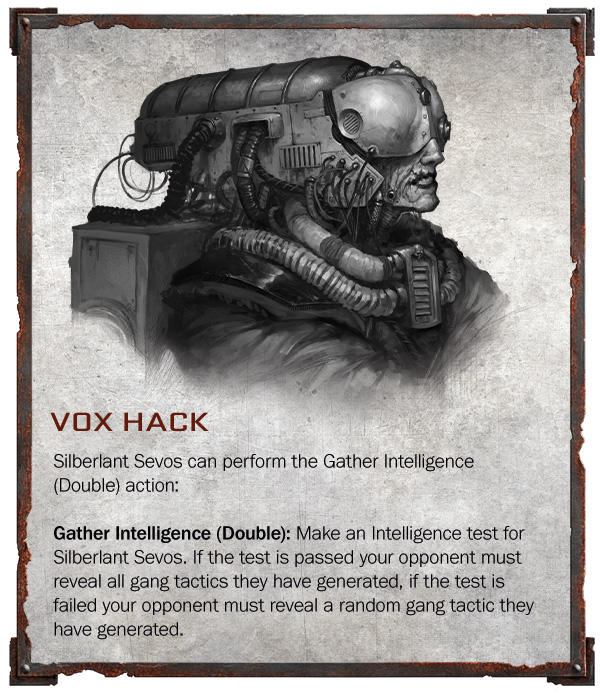 Сильберлант Севос когда-то был оперативником Дома Ван Саар и мечтал слить свой разум с СШК. Он создал синаптический соединитель, что должен был развоплотить его в реале и воплотить в цифровом мире. Но СШК так не думал и разорвал соединение, послав перед этим контримпульс. Это сделало из Севоса калеку, из-за чего напарники по Дому просто взяли и выкинули на свалку за нарушение Трех Законов. В итоге все оказалось не так просто, и наш начинающий Нео понял, что эксперимент по подключению оказался не совсем провальным - Севос начал видеть электронную душу улья, а также научился управлять ближайшими сервиторами. Со временем он создал себе суперкресло и начал продавать свои услуги в качестве торговца шепотом, воруя чужие секреты, текущие по проводам и магистралям улья.