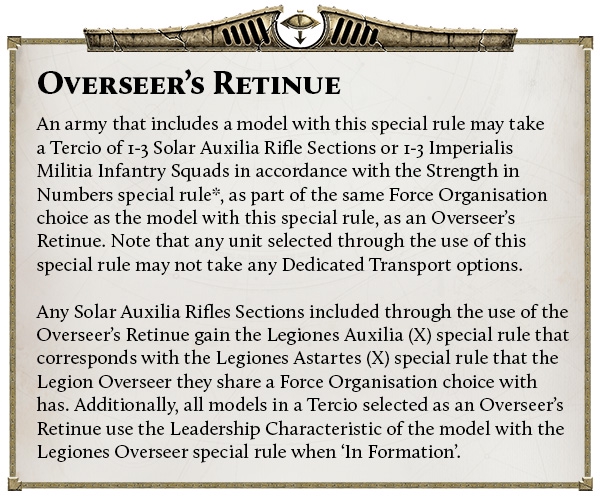 Once a Space Marine of the Legiones Astartes reaches the rank of Centurion, they are given specialist responsibilities and perhaps a fancy new title. Overseers are placed in charge of the legion’s unaugmented human allies, and their ability to factor Solar Auxilia and Imperialis Militias into Space Marine battle plans became increasingly vital as casualties mounted during the Horus Heresy.